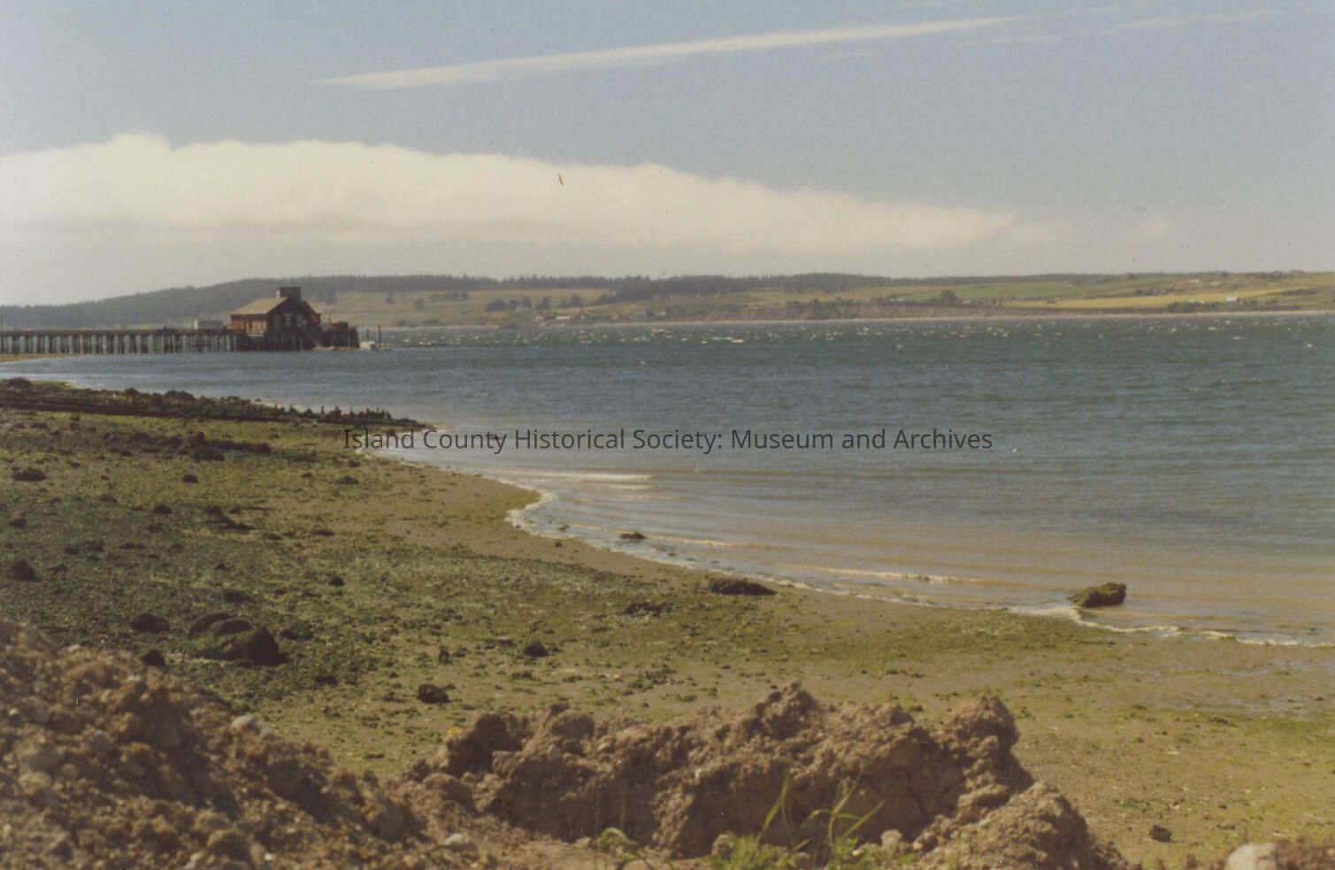 A color photograph of the wharf and pier in Coupeville, with the beach in the foreground, slightly more zoomed out than 2020.032.003.