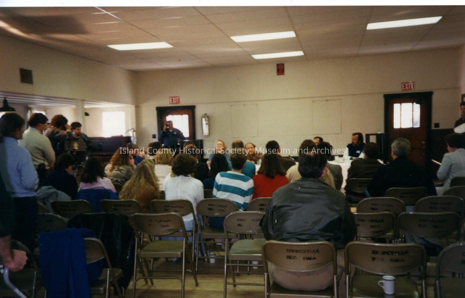 The Coupeville site of the Twentieth Century Fox film "The War of the Roses", released in December 1989. This is the interior of the Coupeville Recreation Hall on Coveland Street. Seen facing the camera are Danny DeVito (center) and Katheen Turner on his right. There are no notes on the reverse of the photo.