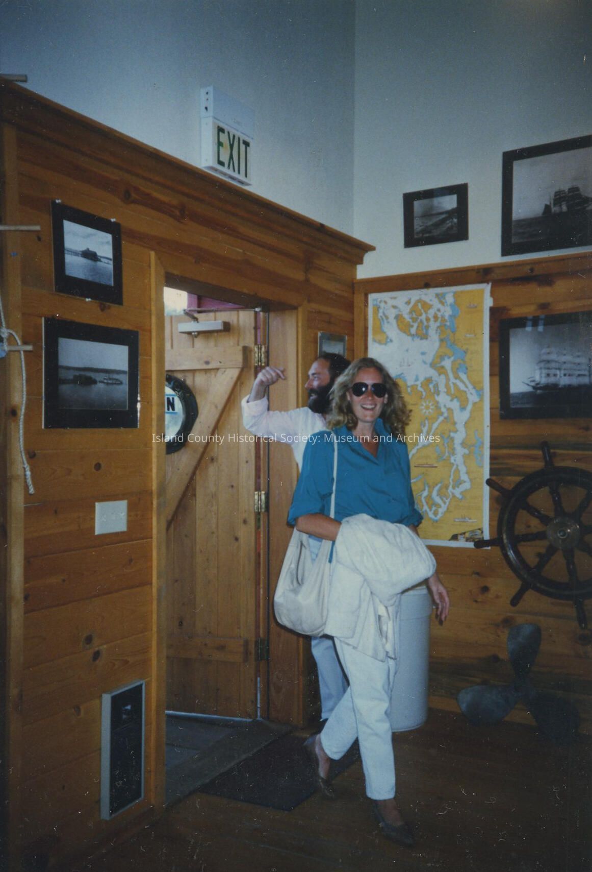 A color photograph of a woman and a man entering the wharf in Coupeville, Washington.
