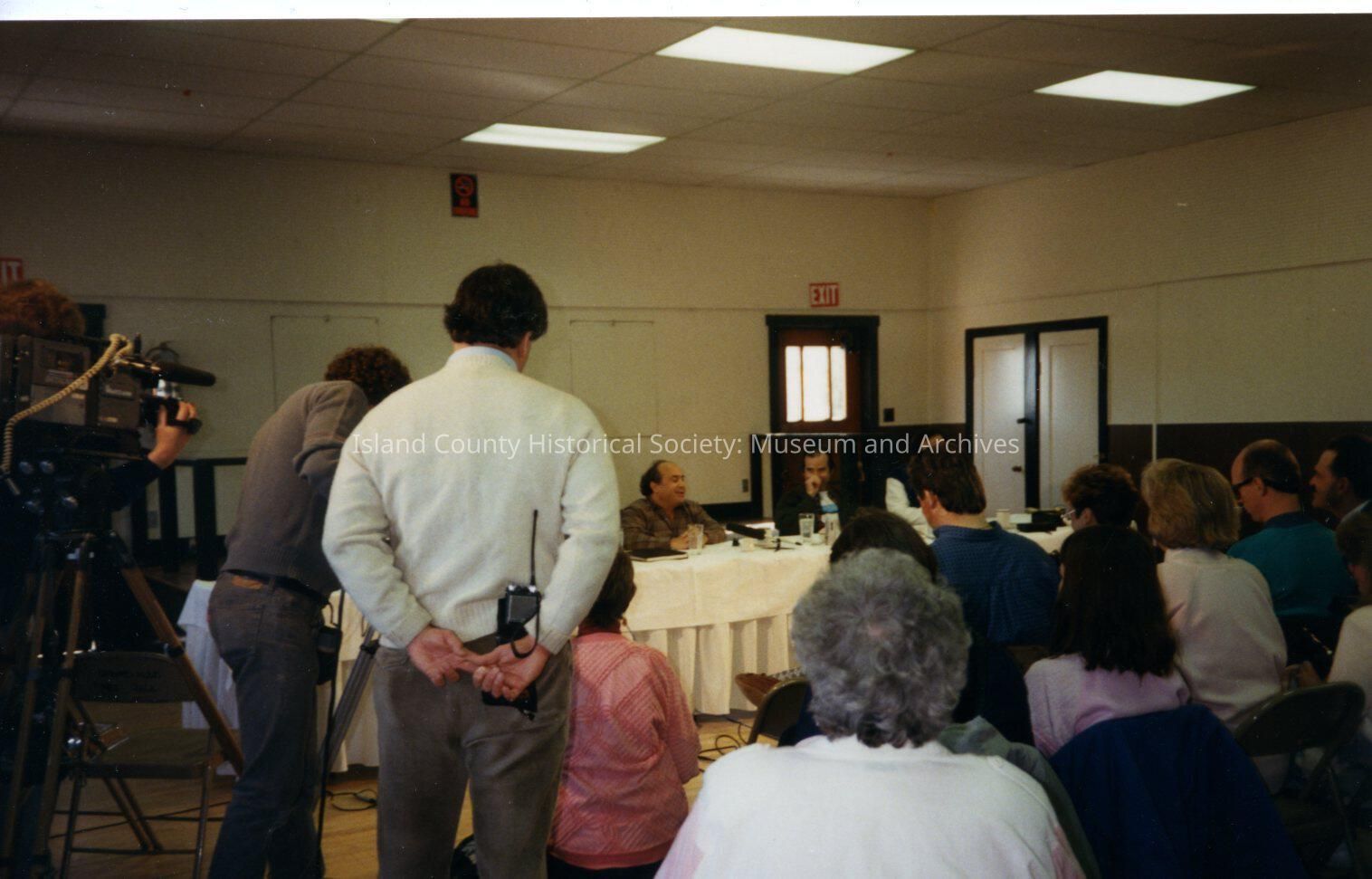 The Coupeville site of the Twentieth Century Fox film "The War of the Roses", released in December 1989. This is the interior of the Coupeville Recreation Hall, where the cast and crew of the film are meeting. Visible in the center of the photo is actor, Danny DeVito. There are no notes on the reverse of the photo.Made/Created