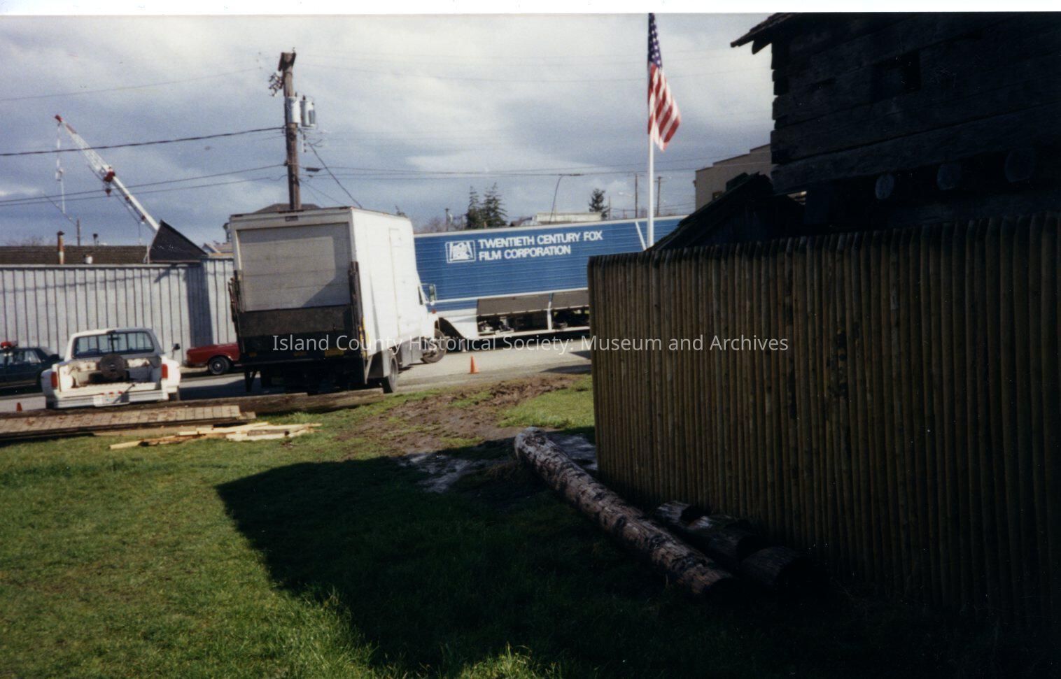 The Coupeville site of the Twentieth Century Fox film "The War of the Roses", released in December 1989. This is Alexander Street, in front of the Alexander Block House and the Island County Historical Society building. Crew vehicles are parked along Alexander street and a crane can be seen on the left above the stores facing Front Street. There are no notes on the reverse of the photo.
