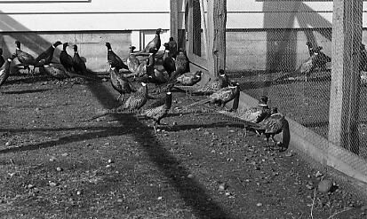 Two dozen plus game birds (pheasants) in a fenced enclosure. Birds have long feathers on their backside, dark crowns, and whitish bands of feather around their necks. Fenced enclosure has a wooden frame and is bordered on one side by a house (white, two visible windows). Birds visible on both sides of the fence gate.Collection