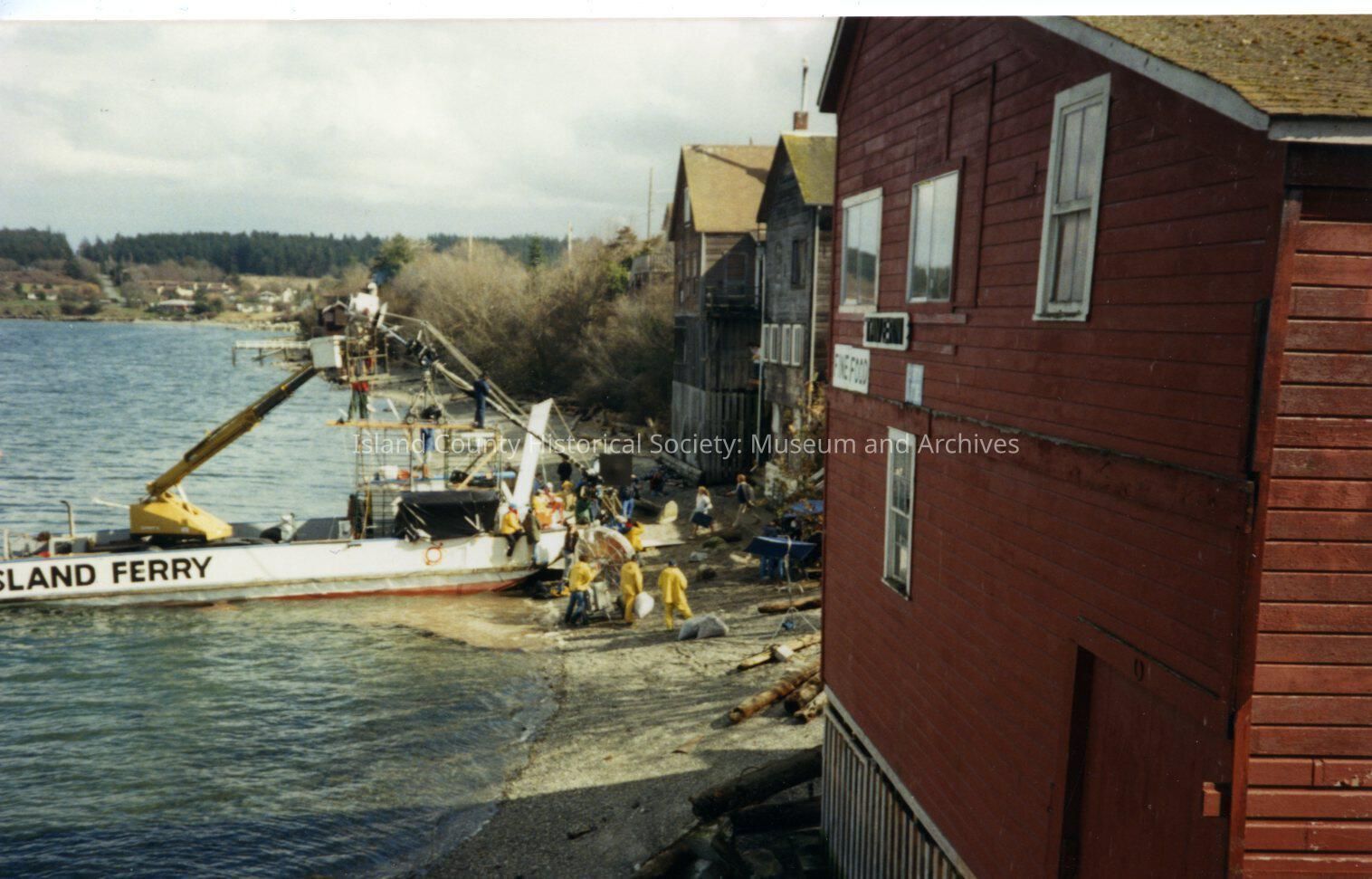 The Coupeville site of the Twentieth Century Fox film "The War of the Roses", released in December 1989. This view faces east, along the waterfront side of the stores and shops on Front Street. The ferry has scaffolding and booms set up to support filiming. There are no notes on the reverse of the photo.Made/Created