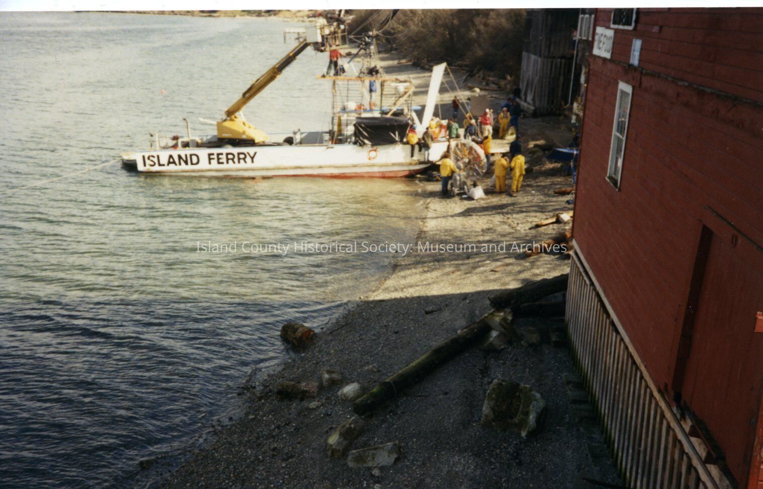 The Coupeville site of the Twentieth Century Fox film "The War of the Roses", released in December 1989. This view faces east on the waterfront side of the stores and shops on Front Street. The ferry has scaffolding and booms set up to support filiming. There are no notes on the reverse of the photo.