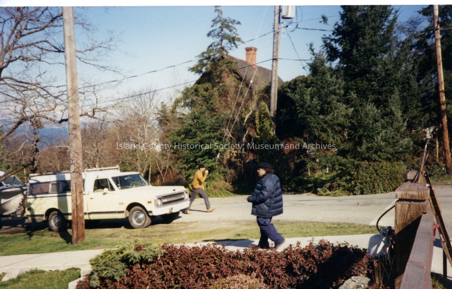 The Coupeville site of the Twentieth Century Fox film "The War of the Roses", released in December 1989. This view faces east, across Main Street between Coveland Street (on right) and Front Street (downhill to left). The person in the blue coat is Danny DeVito