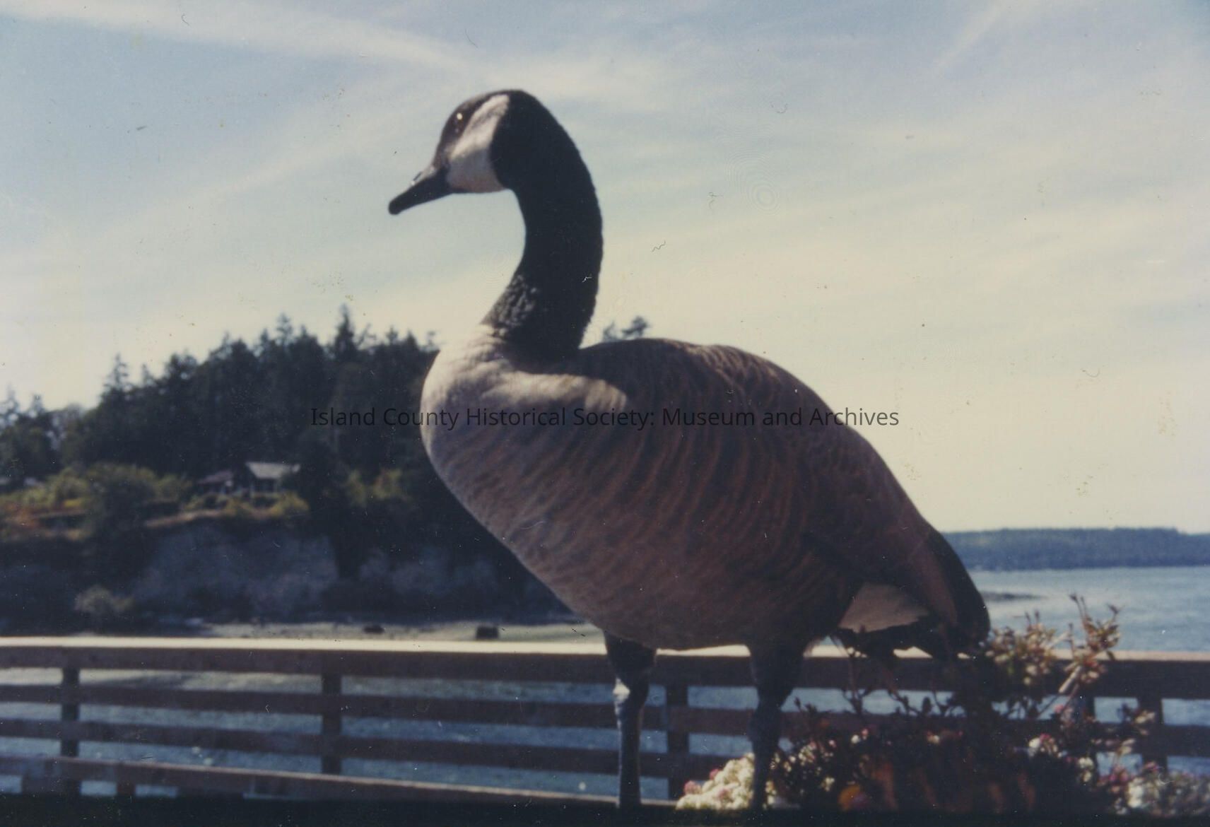 A color photograph of a goose sitting on the railing at the Coupeville Wharf, looking left.