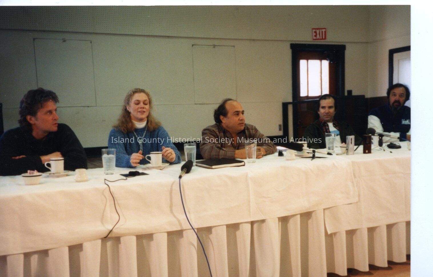 The Coupeville site of the Twentieth Century Fox film "The War of the Roses", released in December 1989. This photo shows a cast meeting inside the Coupeville Recreation Hall. Michael Douglas is on the left, Kathleen Turner next to him and on Kathleen's left is Danny DeVito.Notes of the reverse show Michael Douglas, Kathleen Turner, Danny DeVito and War of the Roses.Made/Created