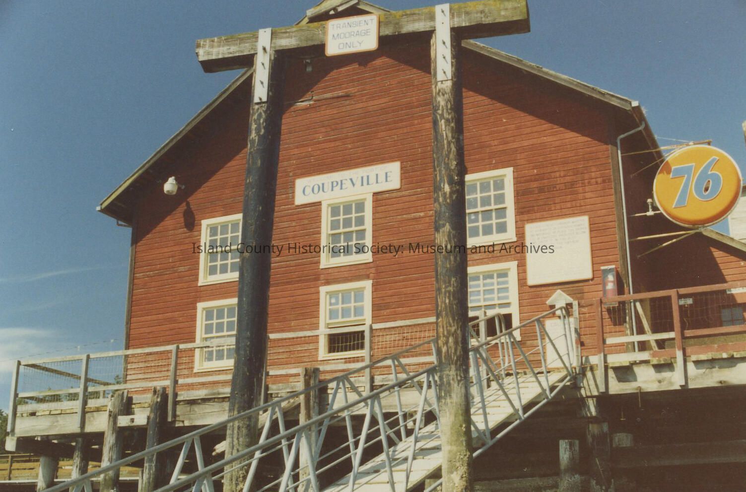 A color photograph of the Coupeville Wharf, with a large orange 76 sign on it, taken from a low angle.