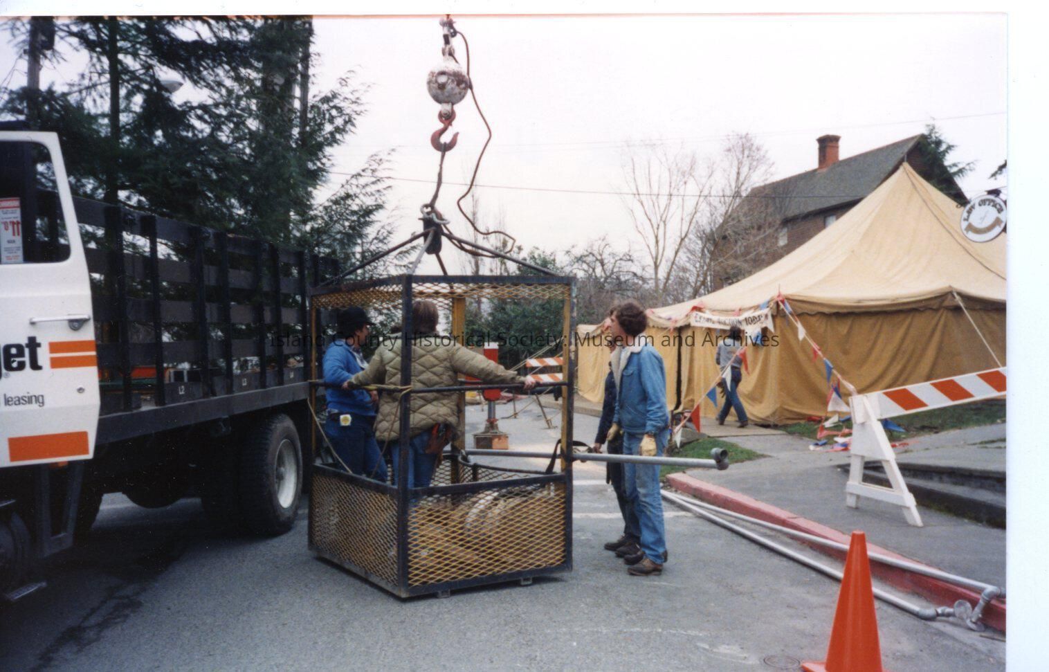 The Coupeville site of the Twentieth Century Fox film "The War of the Roses", released in December 1989. This photo shows set workers hauling a device to 'make rain' Notes on the reverse say Hauling water device to make "rain" for War of the Roses..
