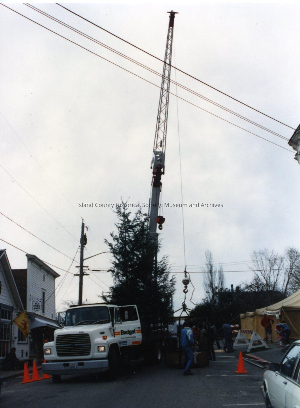 The Coupeville site of the Twentieth Century Fox film "The War of the Roses", released in December 1989. This view shows the rain-making device being hooked to the crane. There are no notes on the reverse of the photo.