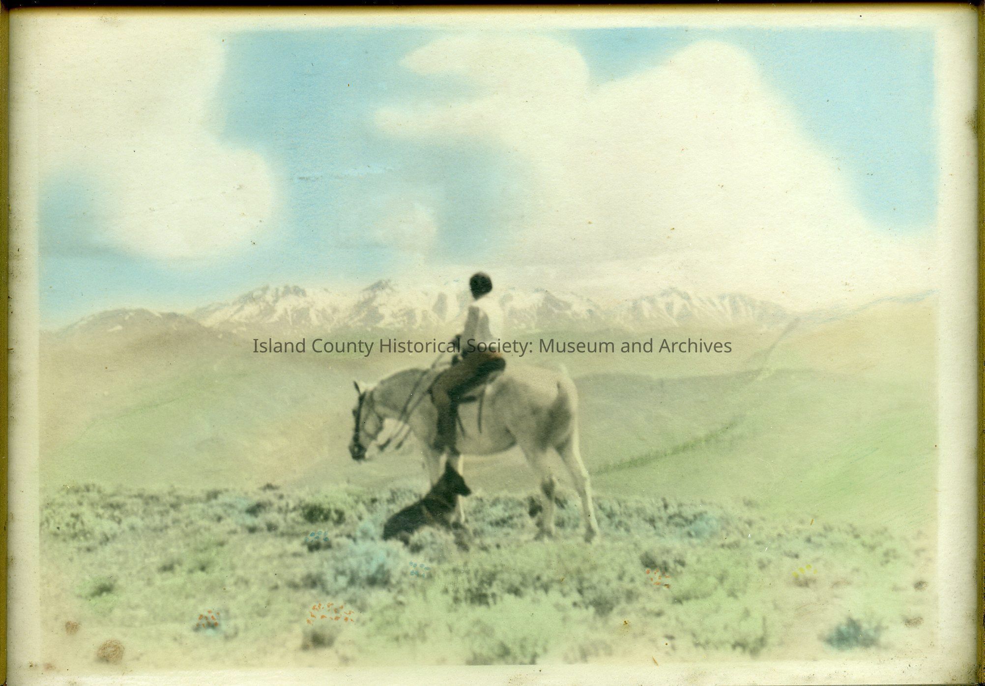 Tinted photo of Doris Monroe Dromolski on horseback w/ German shepherd nearby - in black wooden frame