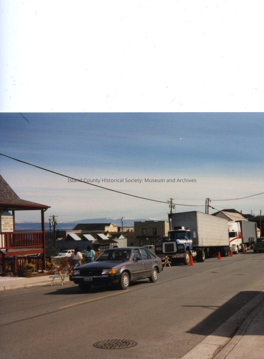 The Coupeville site of the Twentieth Century Fox film "The War of the Roses", released in December 1989. This view shows Coveland Street from the Post Office to the intersection with Main Street. The waterfront is to the left. Equipment trucks are parked along Coveland. tent erected at the intersection of Main and Front Streets. There are no notes on the reverse of the photo.