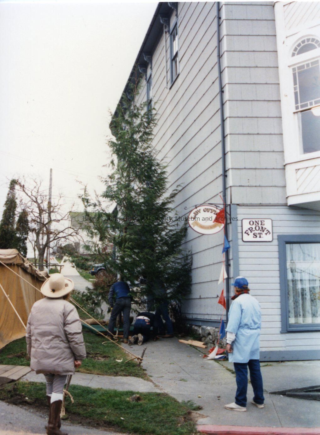 The Coupeville site of the Twentieth Century Fox film "The War of the Roses", released in December 1989. This view shows work being done between the 'auction' tent and Front Street. There are no notes on the reverse of the photo.
