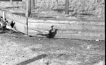 Game birds (pheasants) in a fenced enclosure. Birds have long feathers on their backside, dark crowns, and whitish bands of feather around their necks. Fenced enclosure has a wooden frame with buildings and other fences poles visible in the distance. Long view of fenced enclosure; close-up of right side of enclosure. Solitary bird on right side and a few visible birds on left side. Light image.Collection