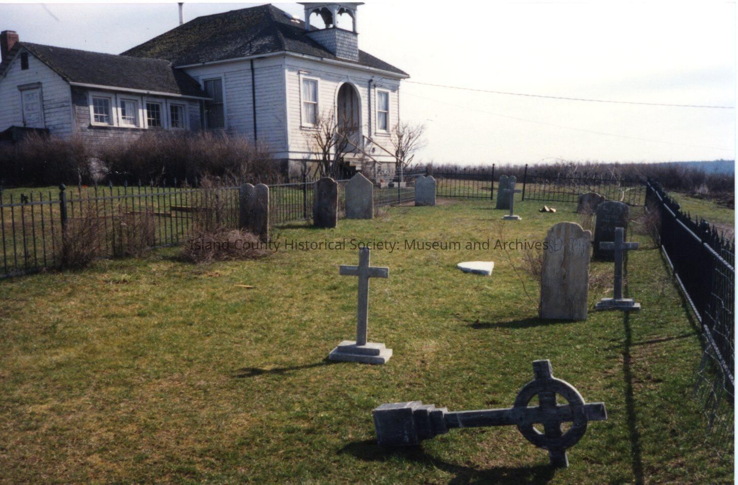 The Coupeville site of the Twentieth Century Fox film "The War of the Roses", released in December 1989. This view shows a 'cemetery', set up near the old San de Fuca Schoolhouse. Notes on the reverse of the photo: "cemetery". in front of San de Fuca school.