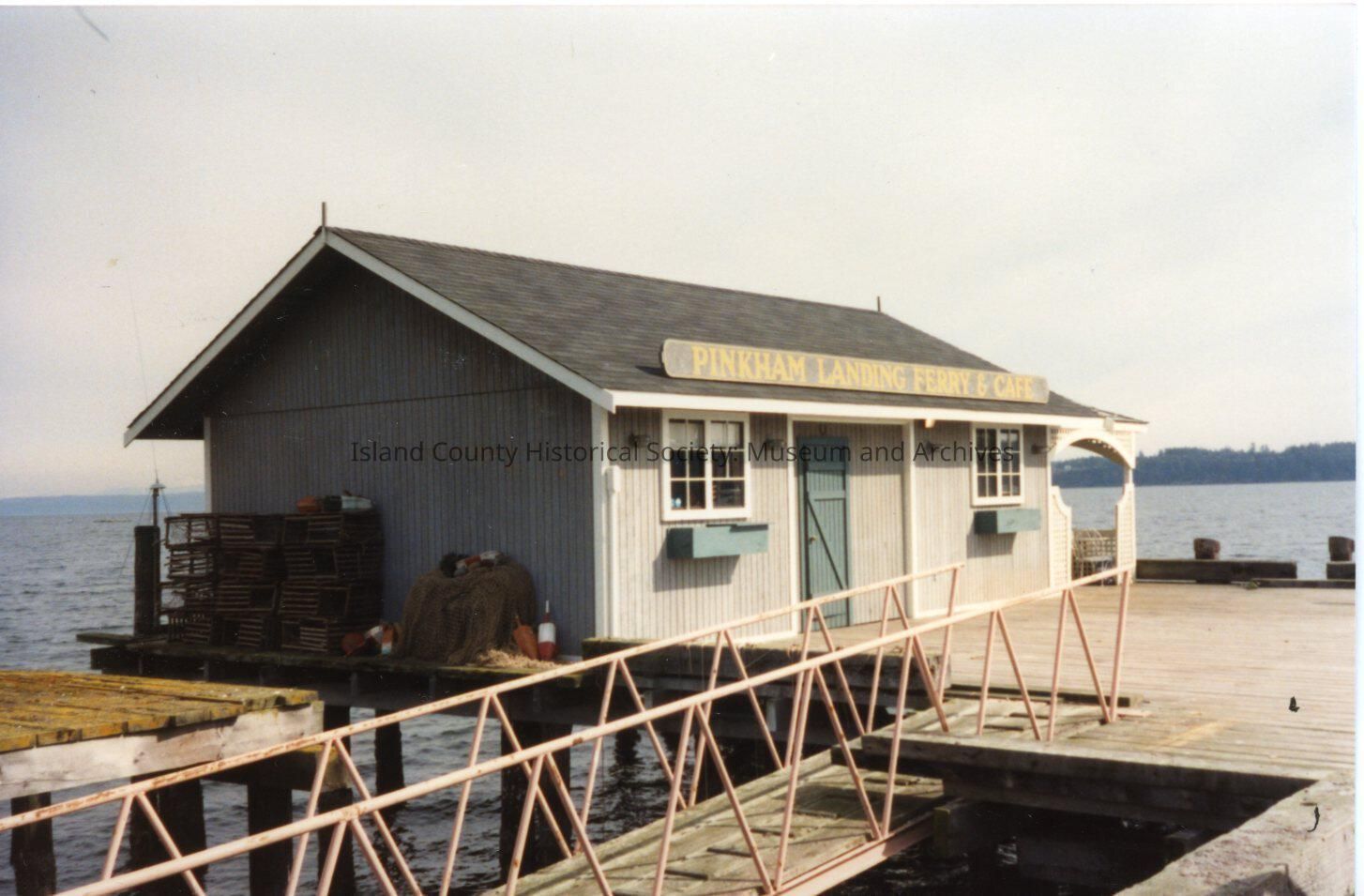 The Coupeville site of the Twentieth Century Fox film "The War of the Roses", released in December 1989. This view shows the former Standard Oil dock made into a Ferry and Cafe for the film. The dock is located at the west end of Penn Cove. There are no notes on the reverse of the photo: