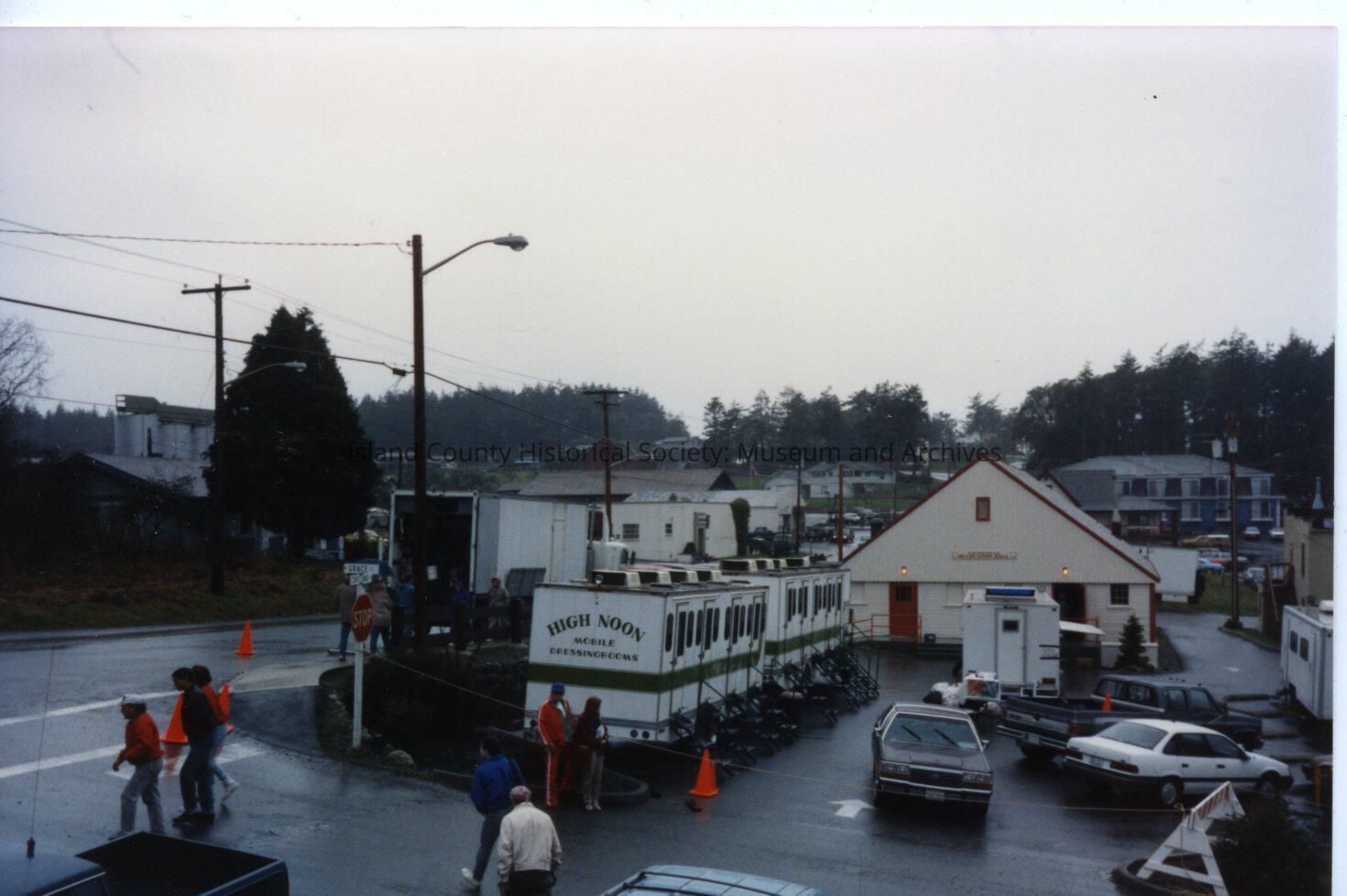 The Coupeville site of the Twentieth Century Fox film "The War of the Roses", released in December 1989. This view shows the Coupeville Recreation Hall and parking lot for Front Street. Turn 90 degrees to the right for the view shown in 2018.052.050. There are no notes on the reverse of the photo: