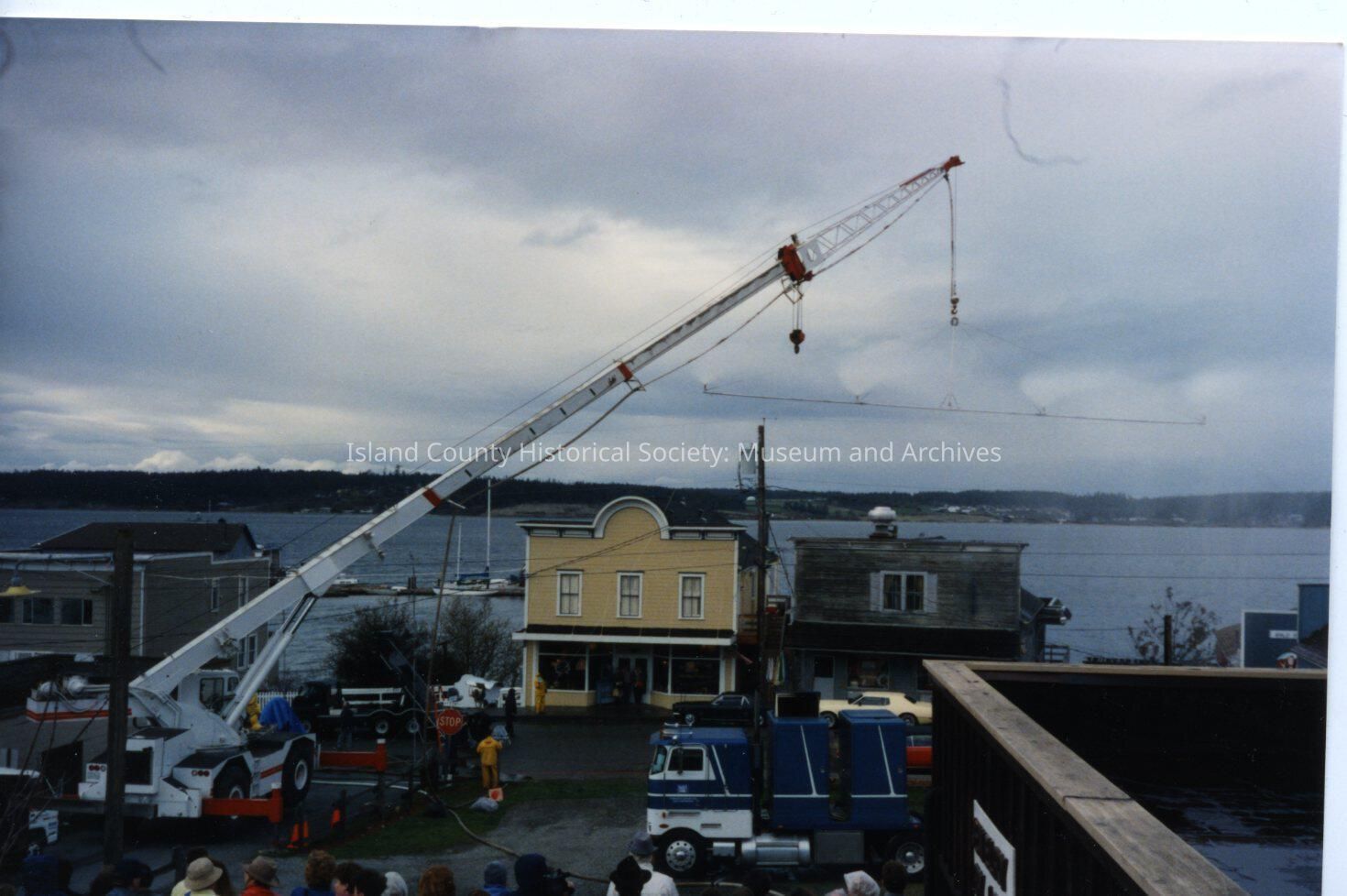The Coupeville site of the Twentieth Century Fox film "The War of the Roses", released in December 1989. This view shows some of the shops on Front Street and the Twentieth Century Fox equipment. There are no notes on the reverse of the photo: