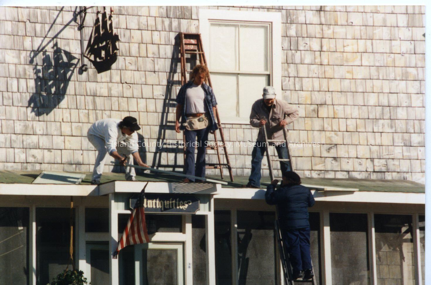 The Coupeville site of the Twentieth Century Fox film "The War of the Roses", released in December 1989. This view shows people working on the facade of the old building at the intersection of Coveland and Main Streets. There are no notes on the reverse of the photo: