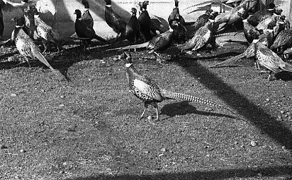 Game birds (pheasants) in a fenced enclosure. Birds have long feathers on backside, dark crowns, and whitish bands of feather around their necks. Foreground: side view of one bird. Fenced enclosure has a wooden frame with white house in the background.Collection