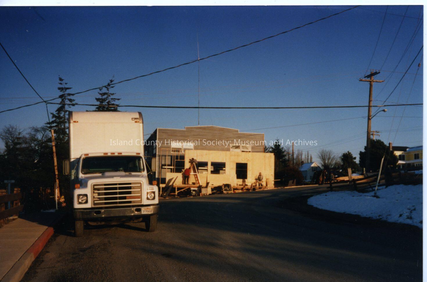 The Coupeville site of the Twentieth Century Fox film "The War of the Roses", released in December 1989. This view shows people working on the facade of the old building at the intersection of Coveland and Main Streets. There are no notes on the reverse of the photo: