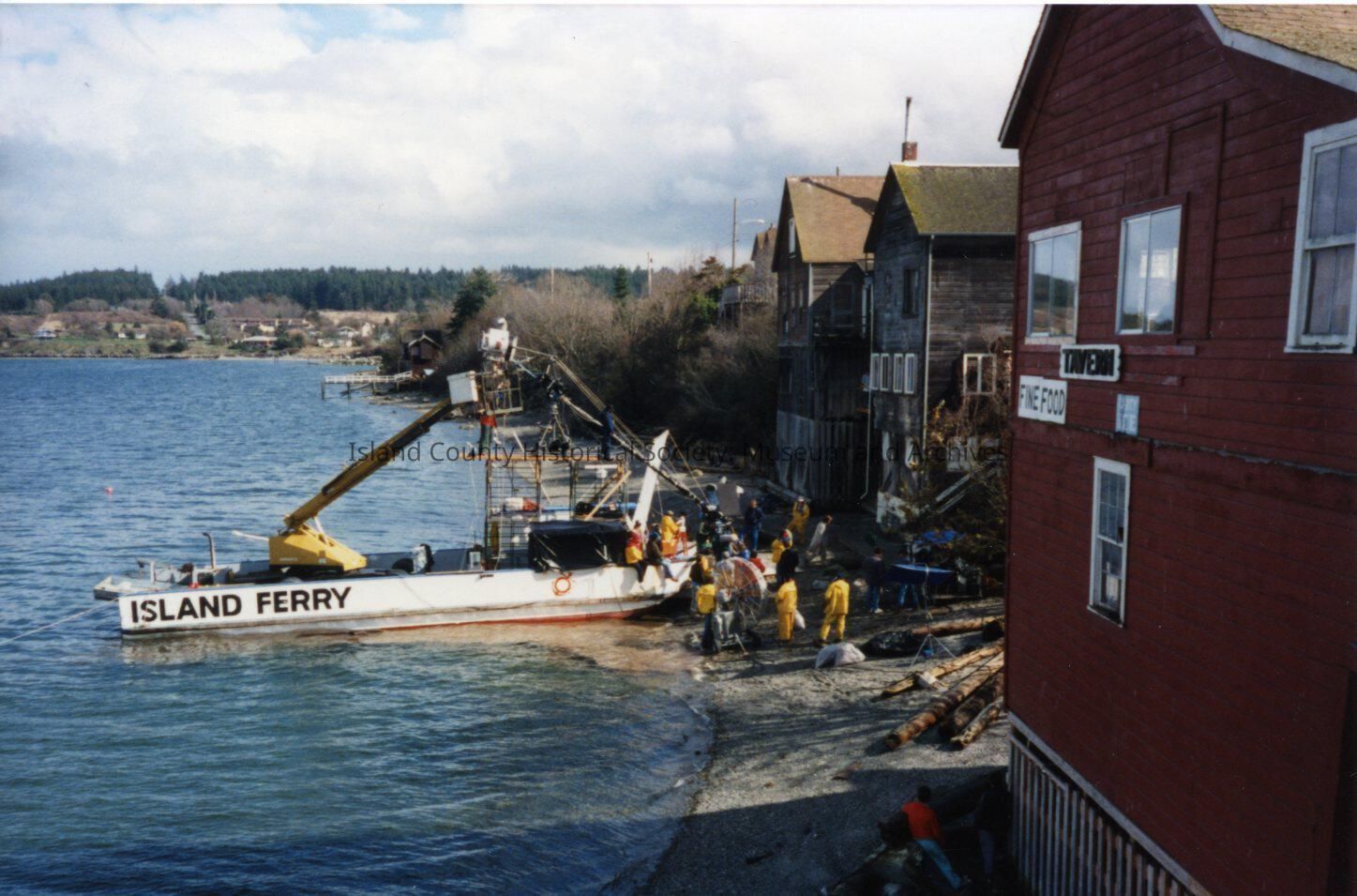 The Coupeville site of the Twentieth Century Fox film "The War of the Roses", released in December 1989. This is another view of the boat, possibly a ferry, used in the filming of in the Front Street area.There are no notes on the reverse of the photo:Made/Created