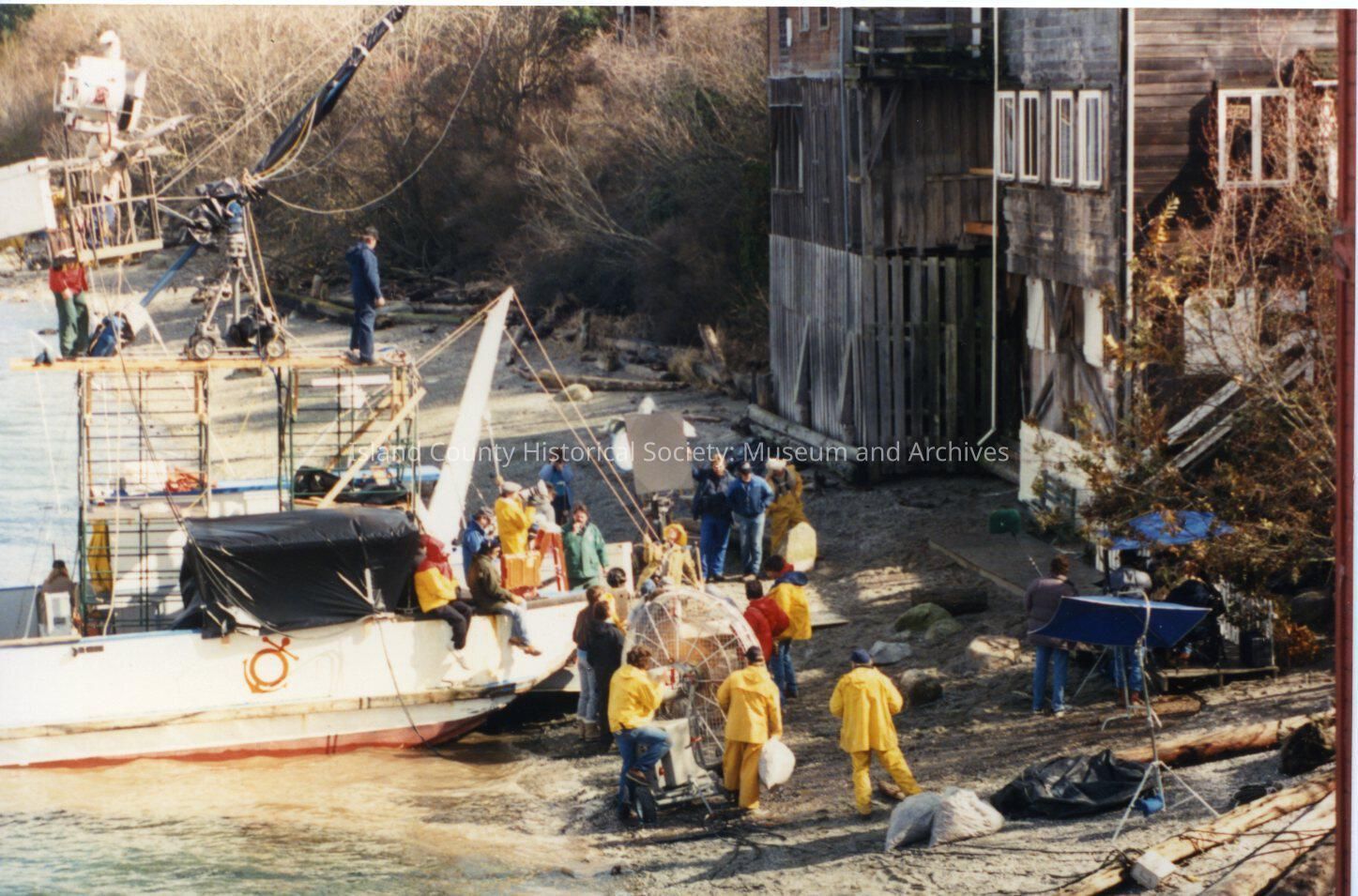 The Coupeville site of the Twentieth Century Fox film "The War of the Roses", released in December 1989. This is another view of the boat, possibly a ferry, used in the filming of in the Front Street area.In this view, a wind machine is used to create the effects of weather. There are no notes on the reverse of the photo:Made/Created