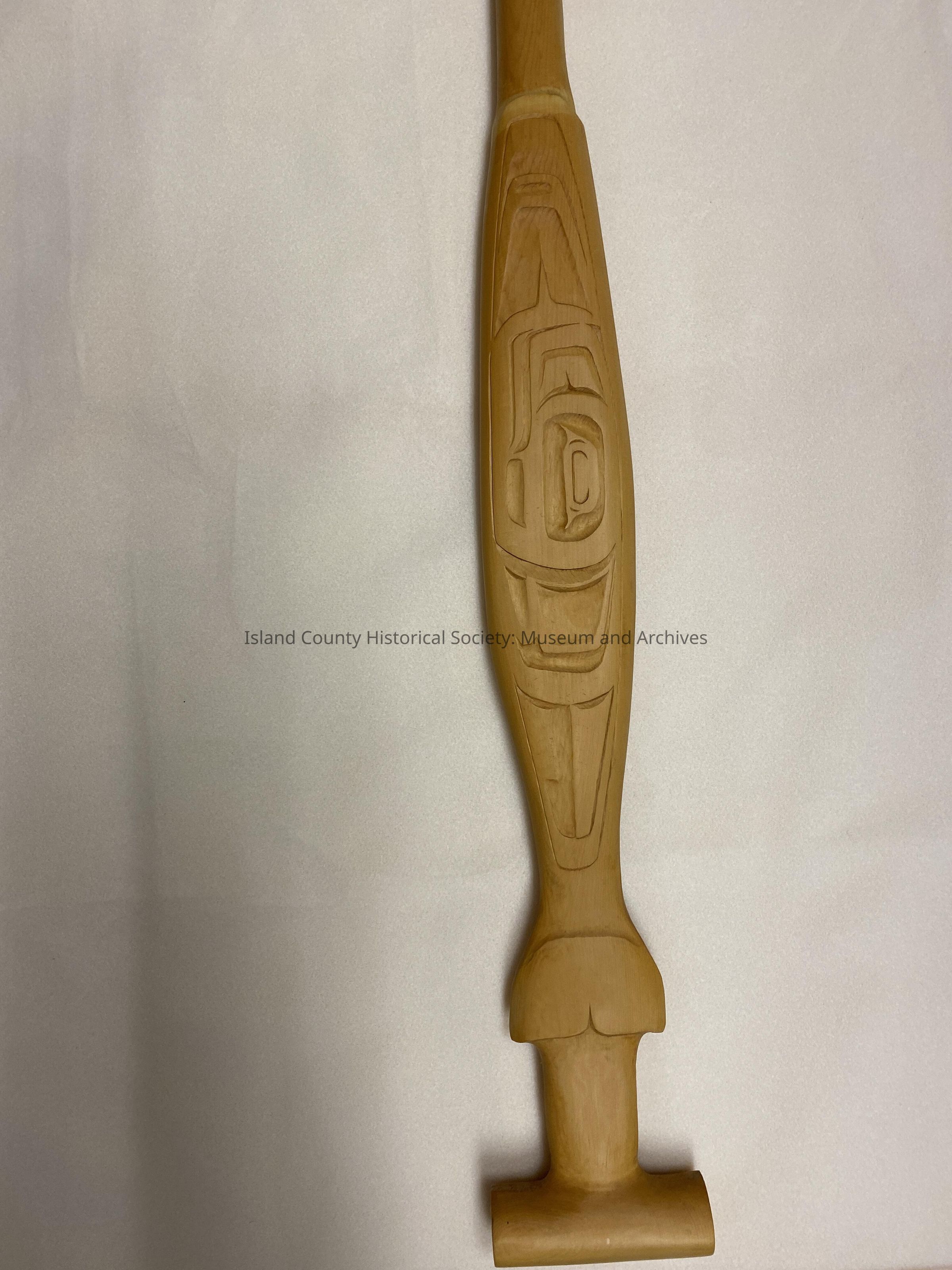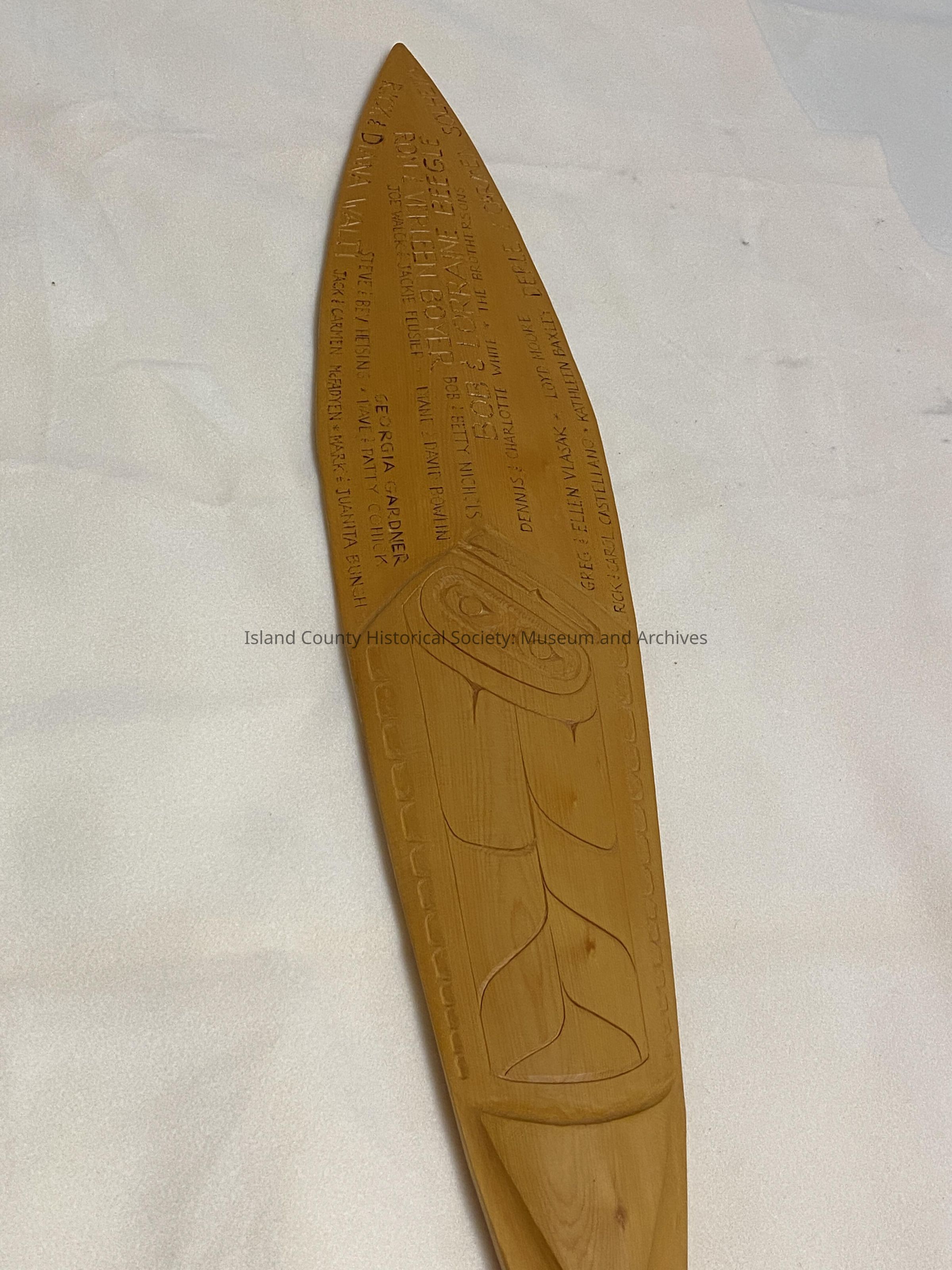 A wooden canoe paddle made of a light colored wood. The front side has names carved into it as well as formline fish.
