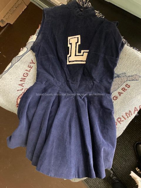 Navy blue corduroy sleeveless cheer jumper w/ white "L" patch sewn to front
