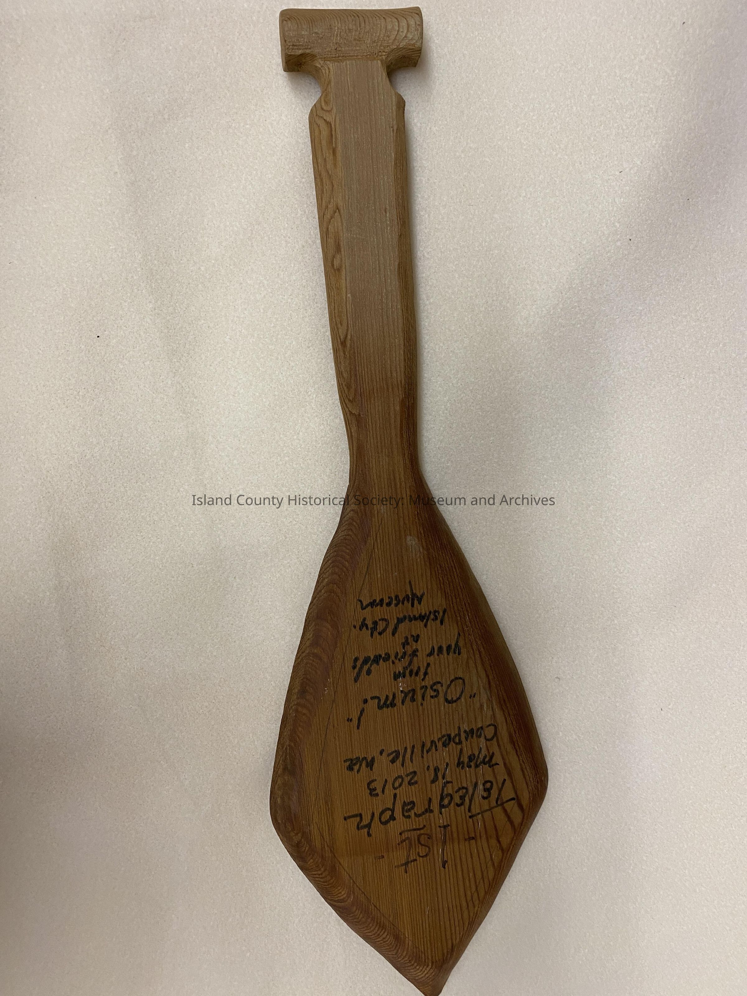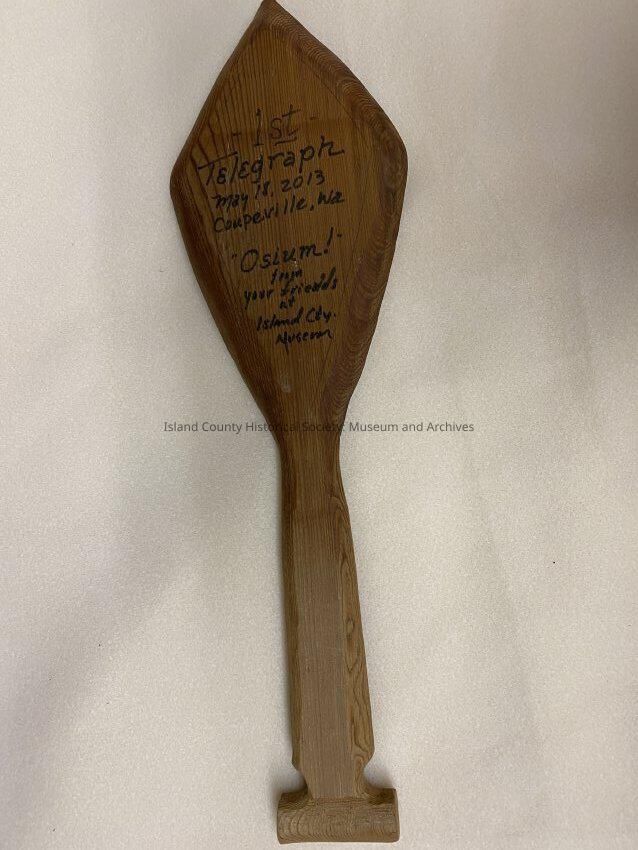 Small decorative canoe paddle that says " 1st telegraph may 18 2013 Coupeville WA. Osium! from your friends at Island Cty Museum"