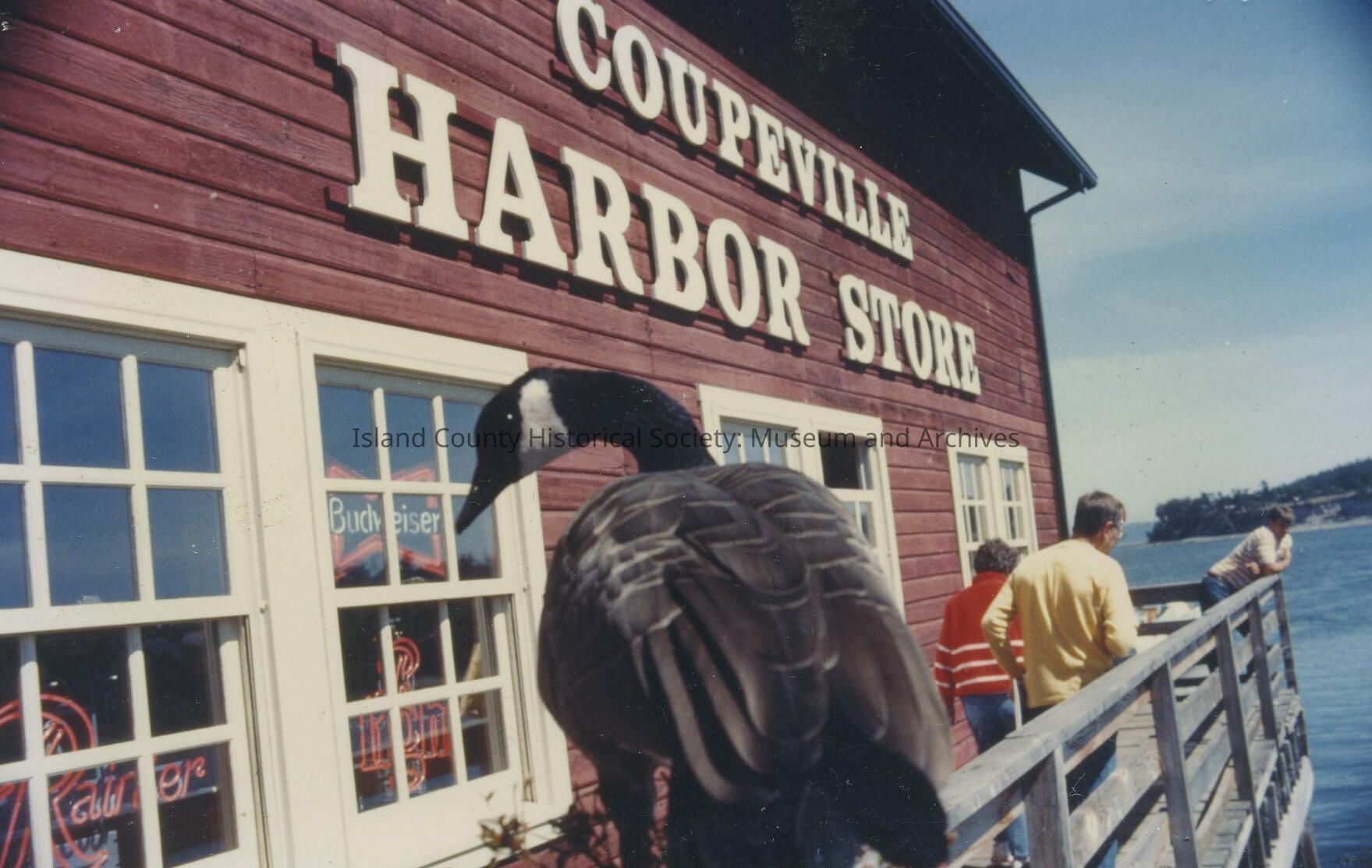 A color photograph of a goose sitting on the railing at the Coupeville Wharf with people in the background.