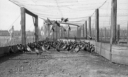 A few dozen game birds (pheasants or partridges, perhaps) in a fenced enclosure. Birds have long feathers on backside, dark crowns, and whitish bands of feather around their necks. Three coups (?) visible with birds back and a few birds in flight. A person (wearing sweater, pants) visible outside fence on left side of image.Collection