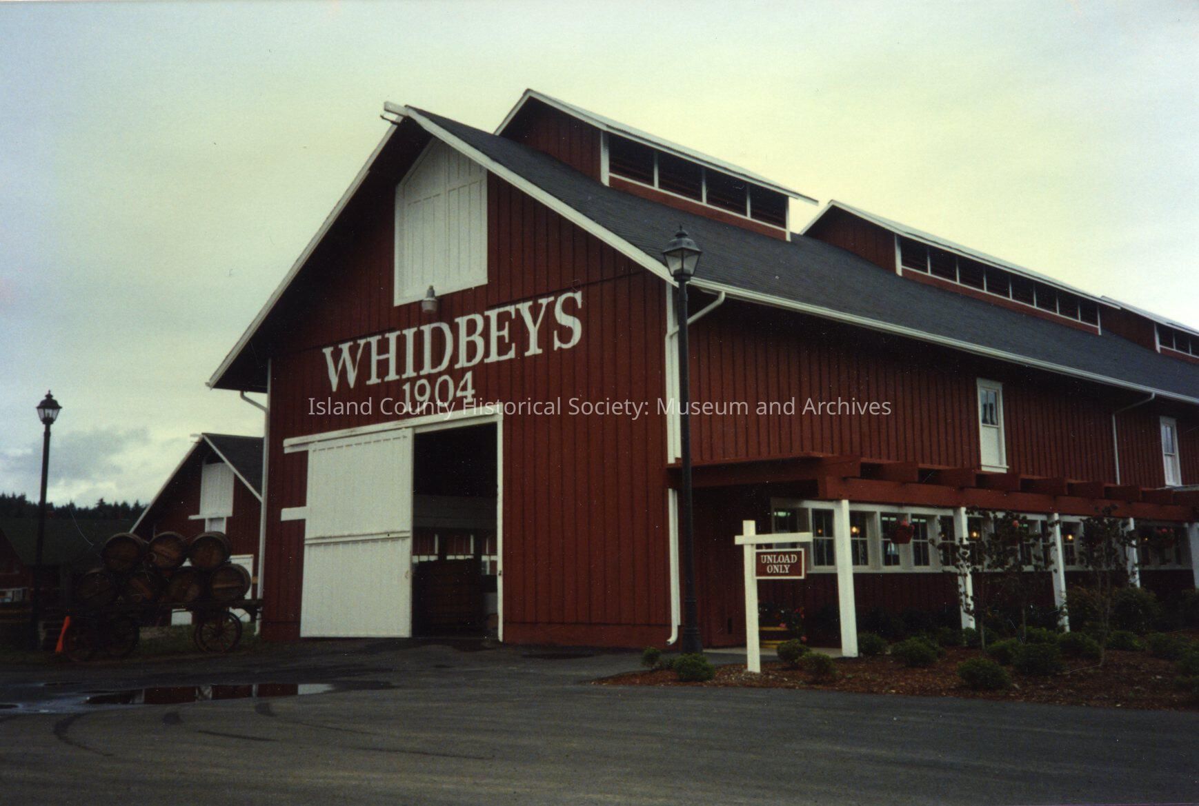 Greenbank Farm building, old barn shape, red. Says Whidbeys 1904 on top of opening.