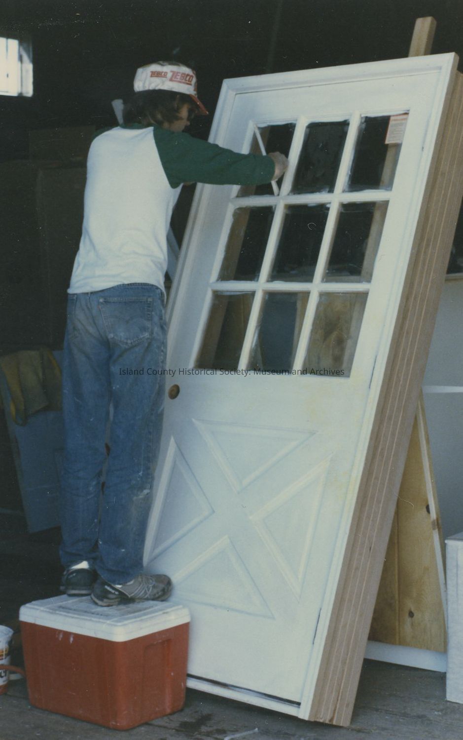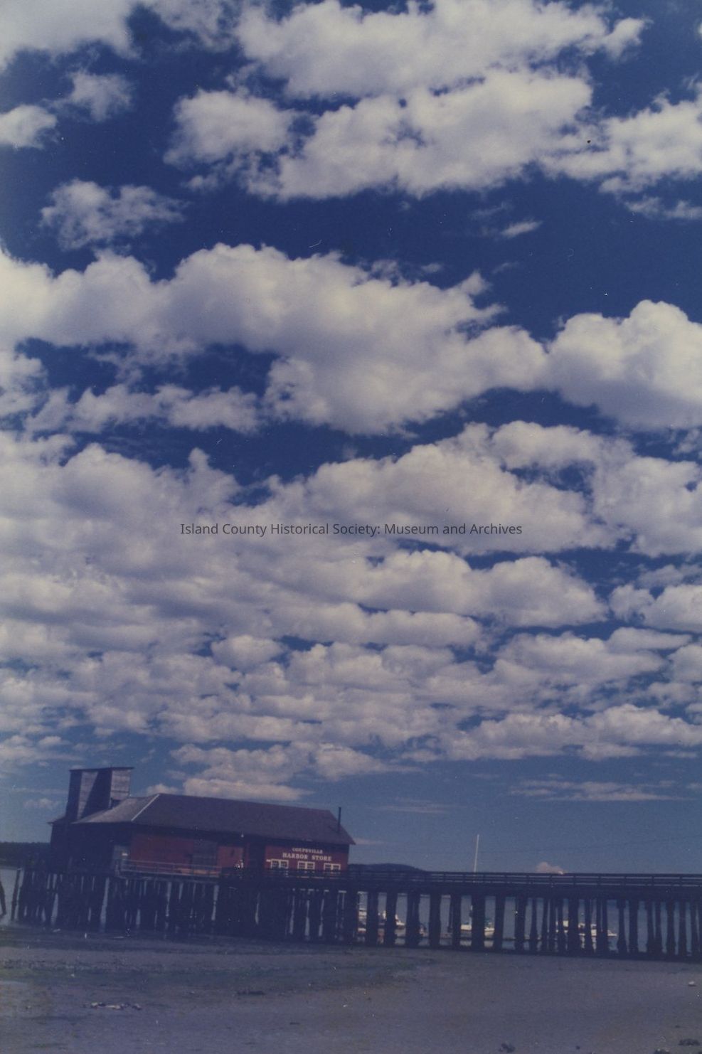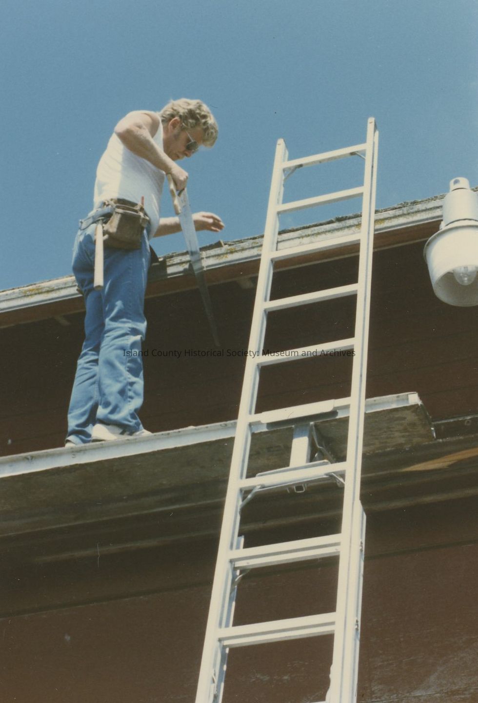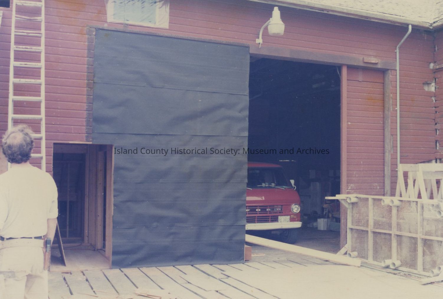 A color photograph of a man drawing, wearing a hat and sitting outside the Coupeville Wharf