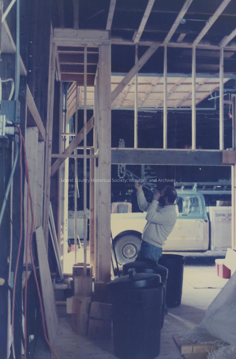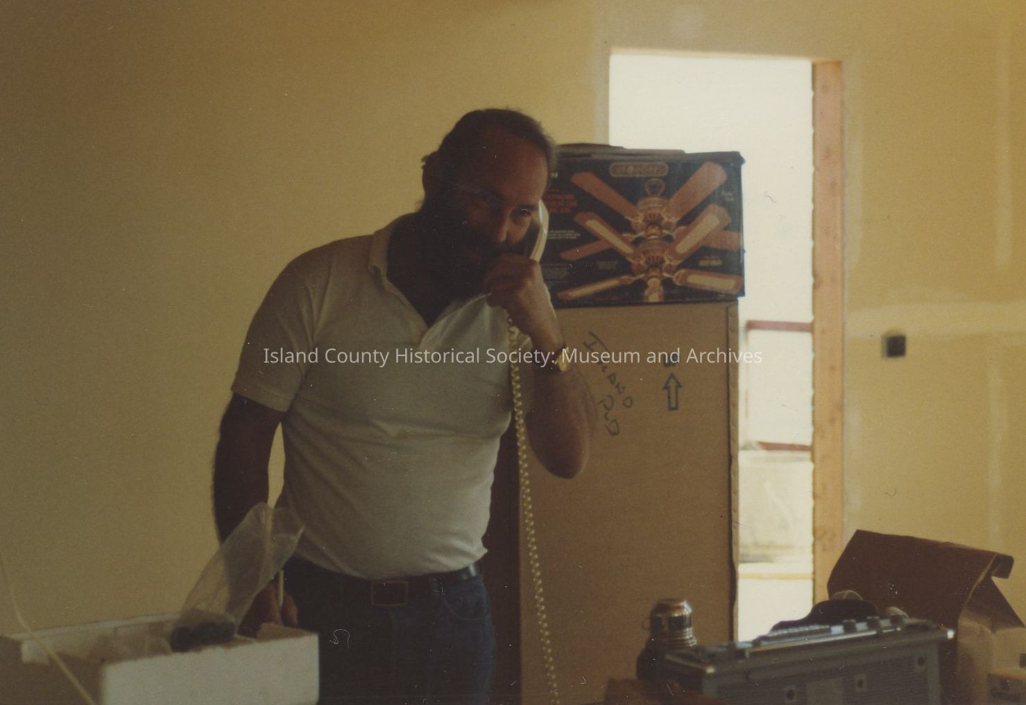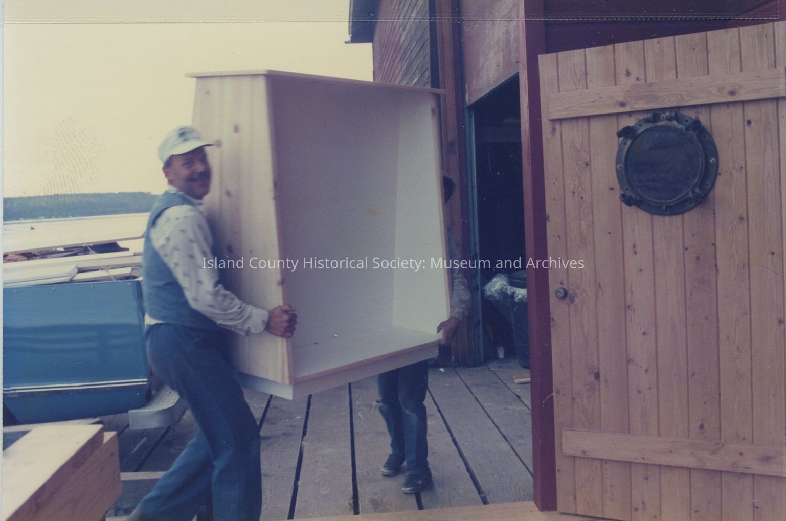 A color photograph of a man drawing, wearing a hat and sitting outside the Coupeville Wharf
