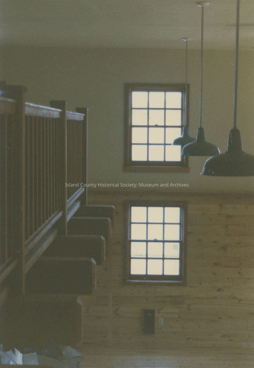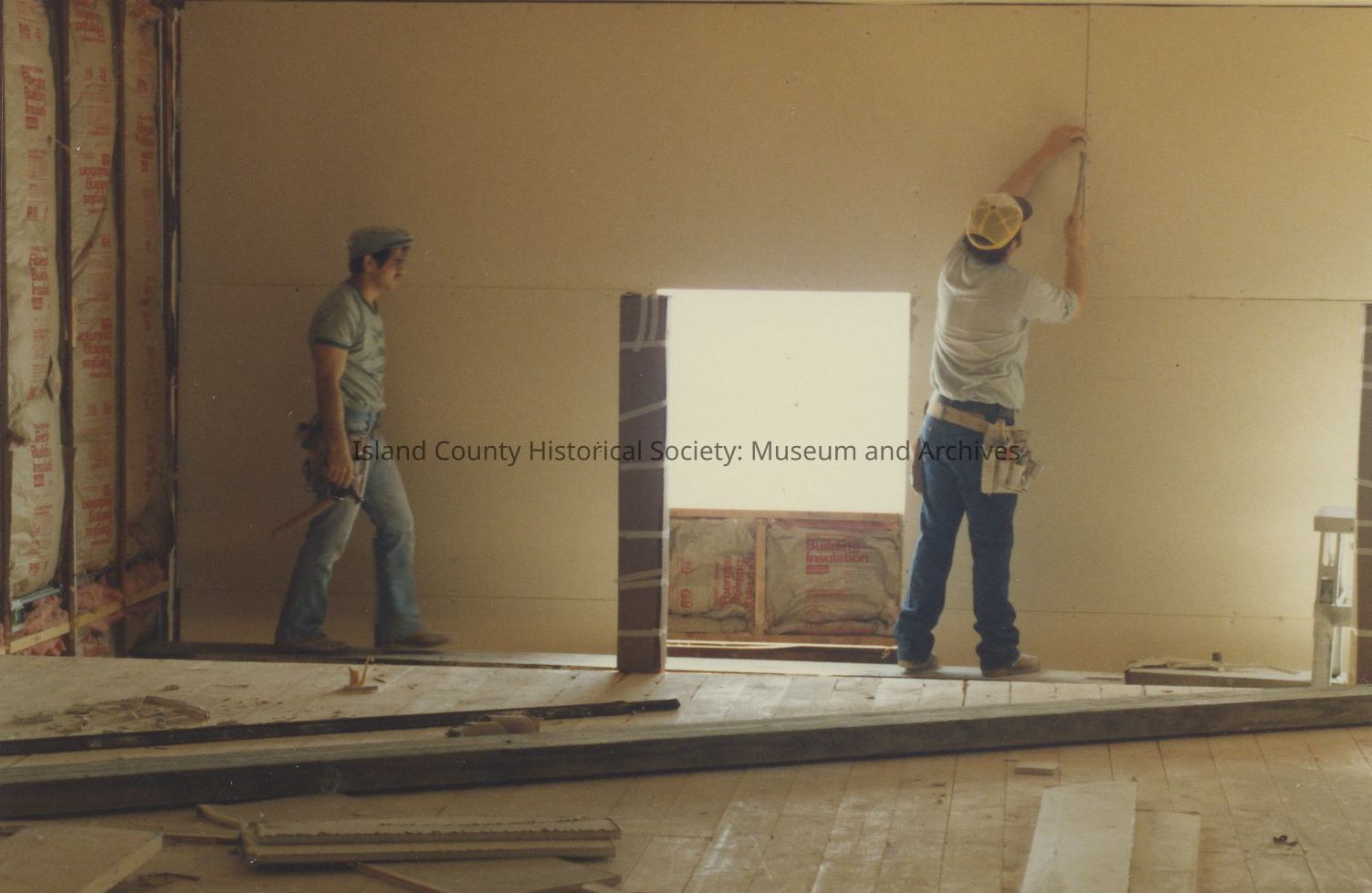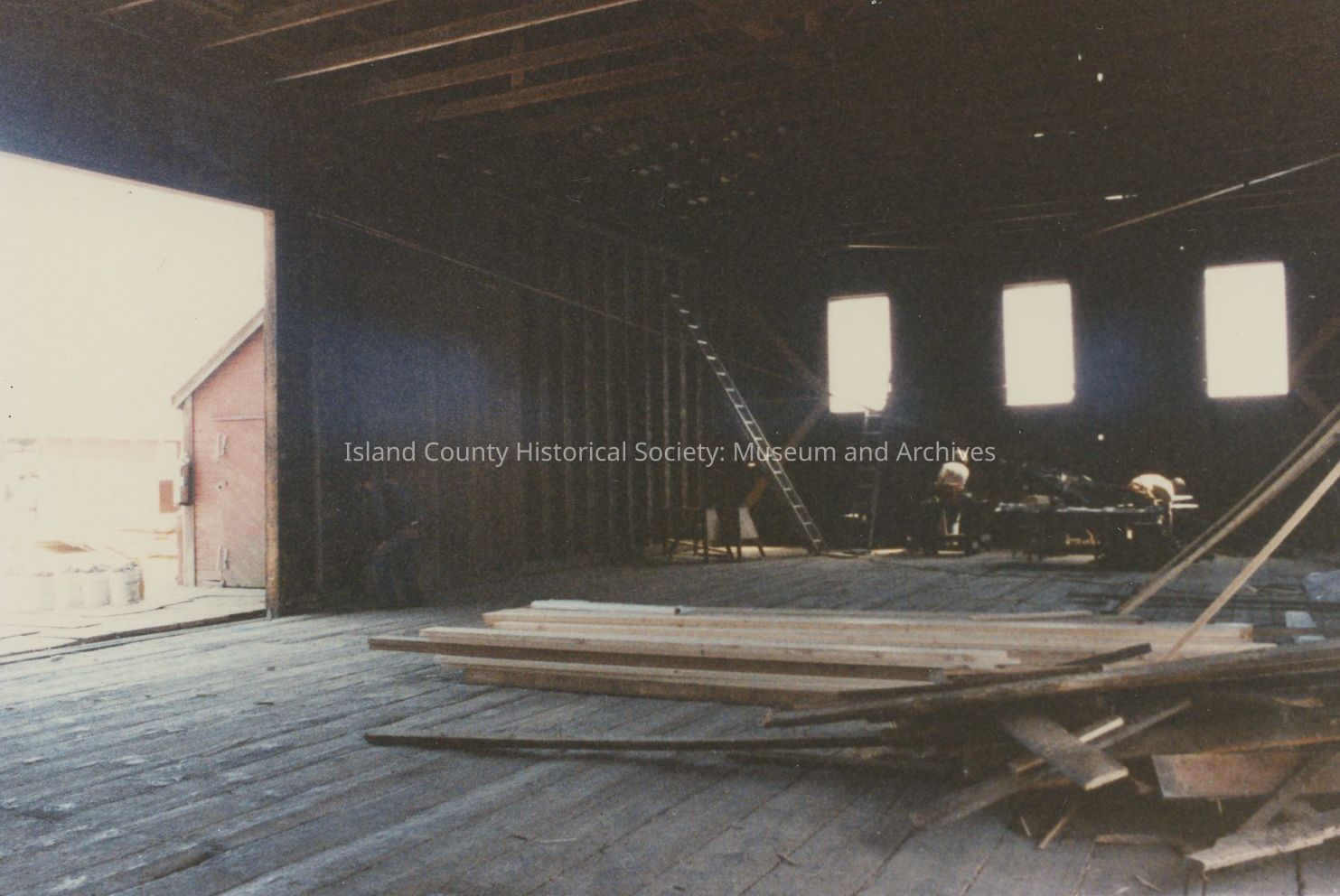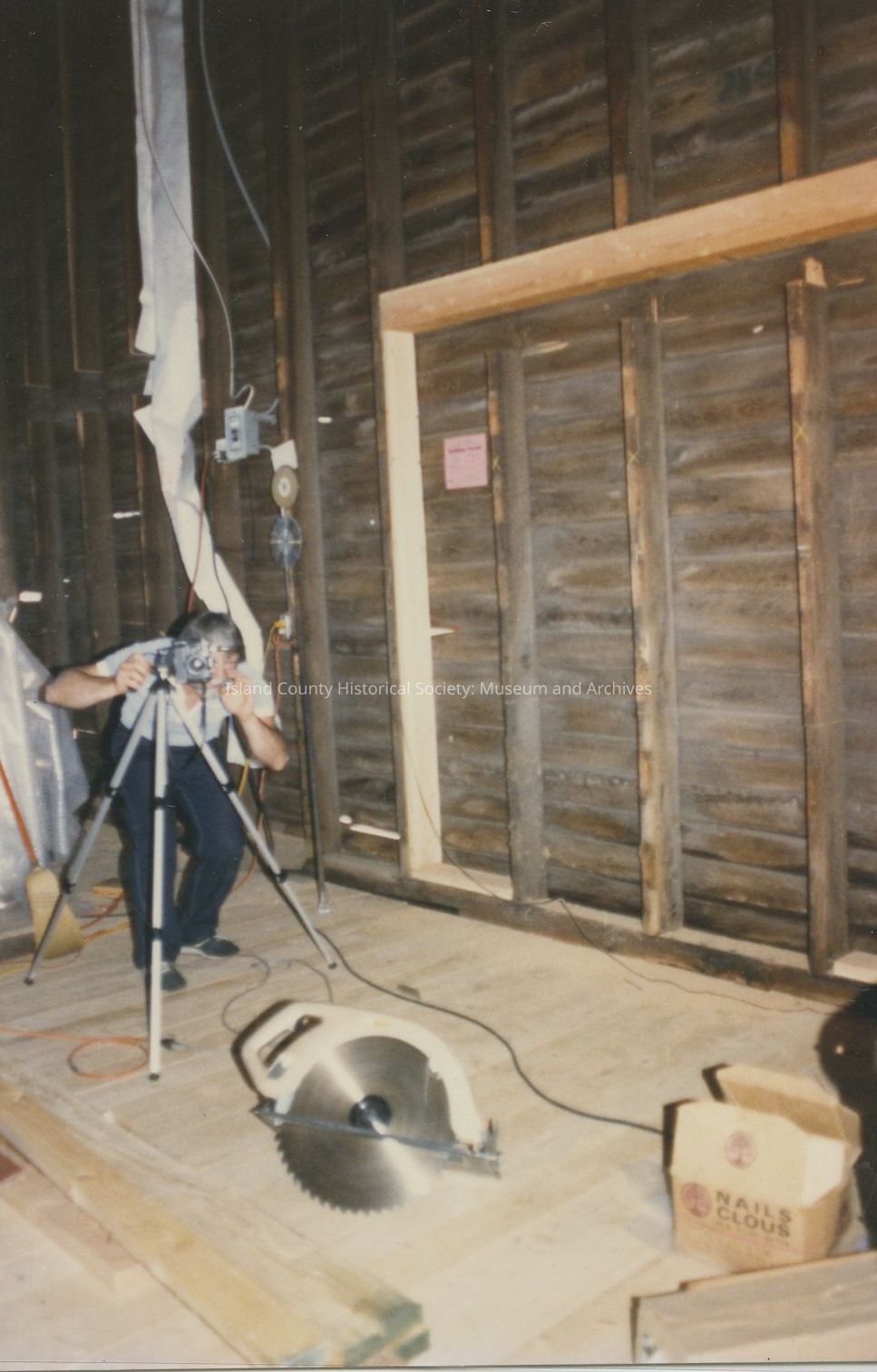 A color photograph of a man drawing, wearing a hat and sitting outside the Coupeville Wharf
