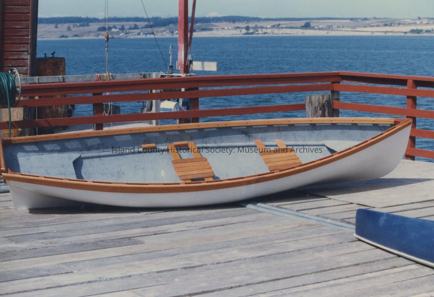 A color photo of a canoe sitting outside the Coupeville Wharf.