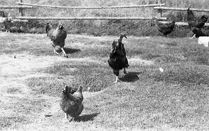 Chickens in a fenced enclosure (3 chickens center; 3 chickens in background). Grassy field beyond chicken area.Collection
