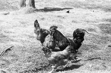 Three chickens in a field, center of image. A person's legs and shadow visible in background.Collection