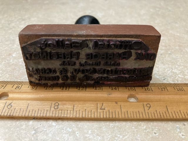 wooden stamp once belonged to Jerome Ely, "Official Ballot Oak Harbor Precinct, Island Cty, Wash, Election Nov. 4, 1896" Furnished by J. Libbey