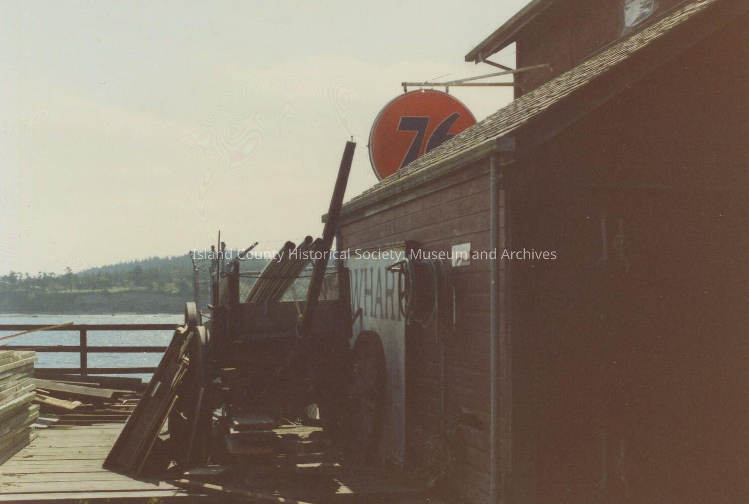 A color photograph of the side of the Coupeville Wharf, with a large 76 sign