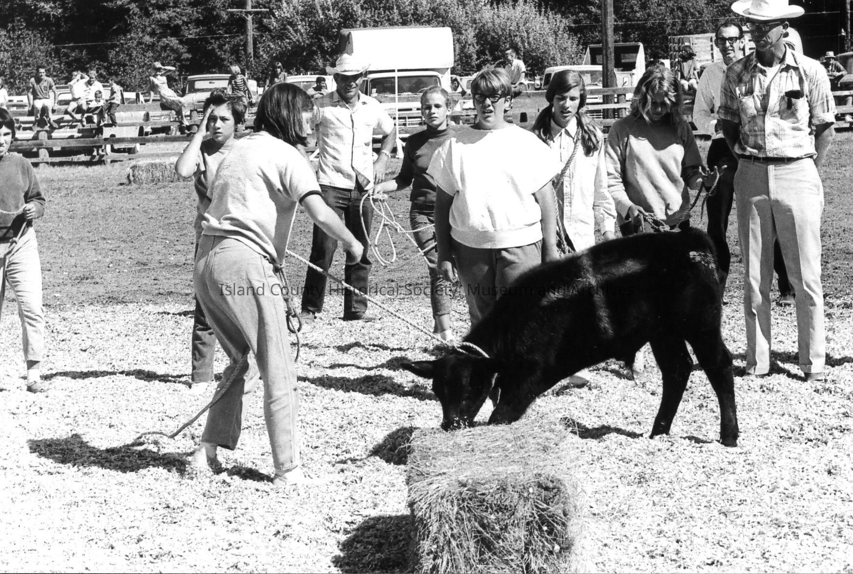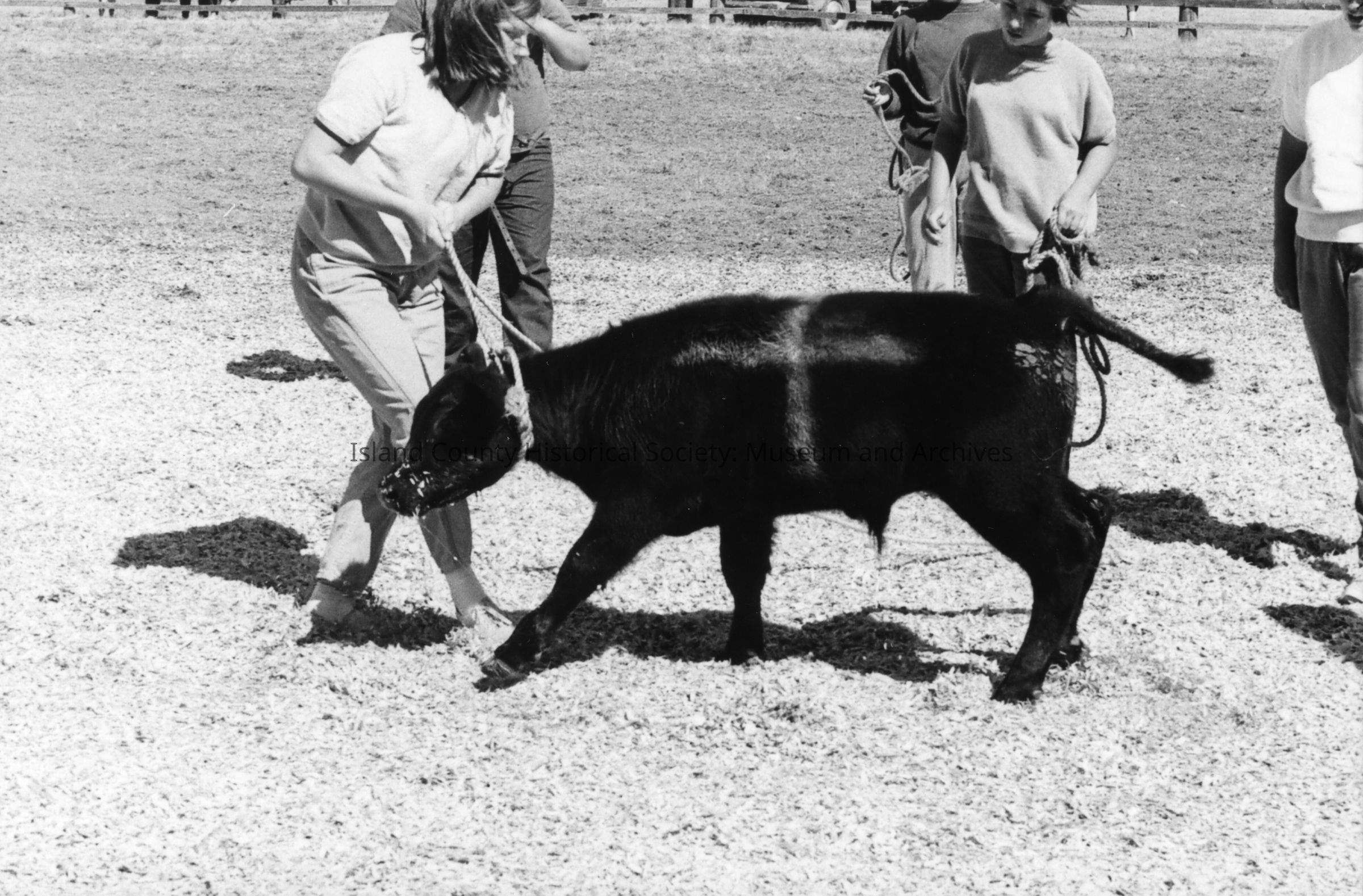 At the Island County Fair, a teenage girl walks her calf with a rope while other kids and adults look on. The calf has a cross on its back.Photograph Details