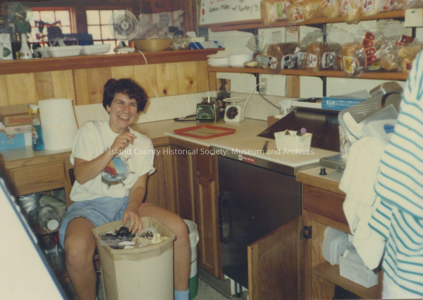 A color photograph of a women sitting and laughing inside the kitchen of the Coupeville Wharf.