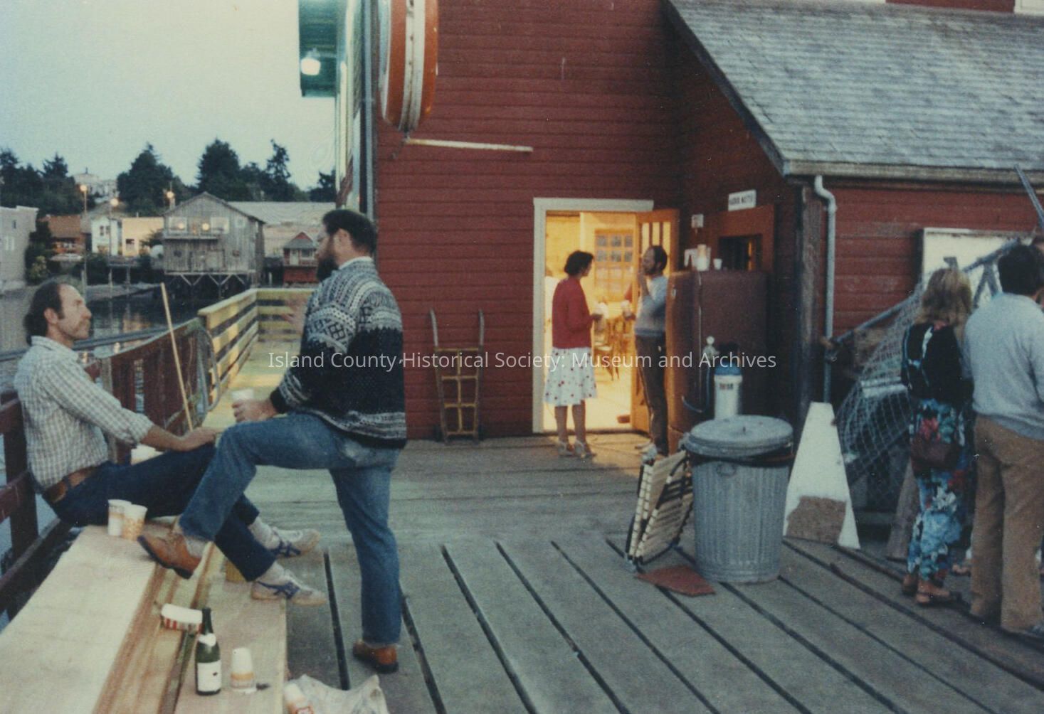 A color photograph of a group of people standing out on the porch behind the Coupeville Wharf