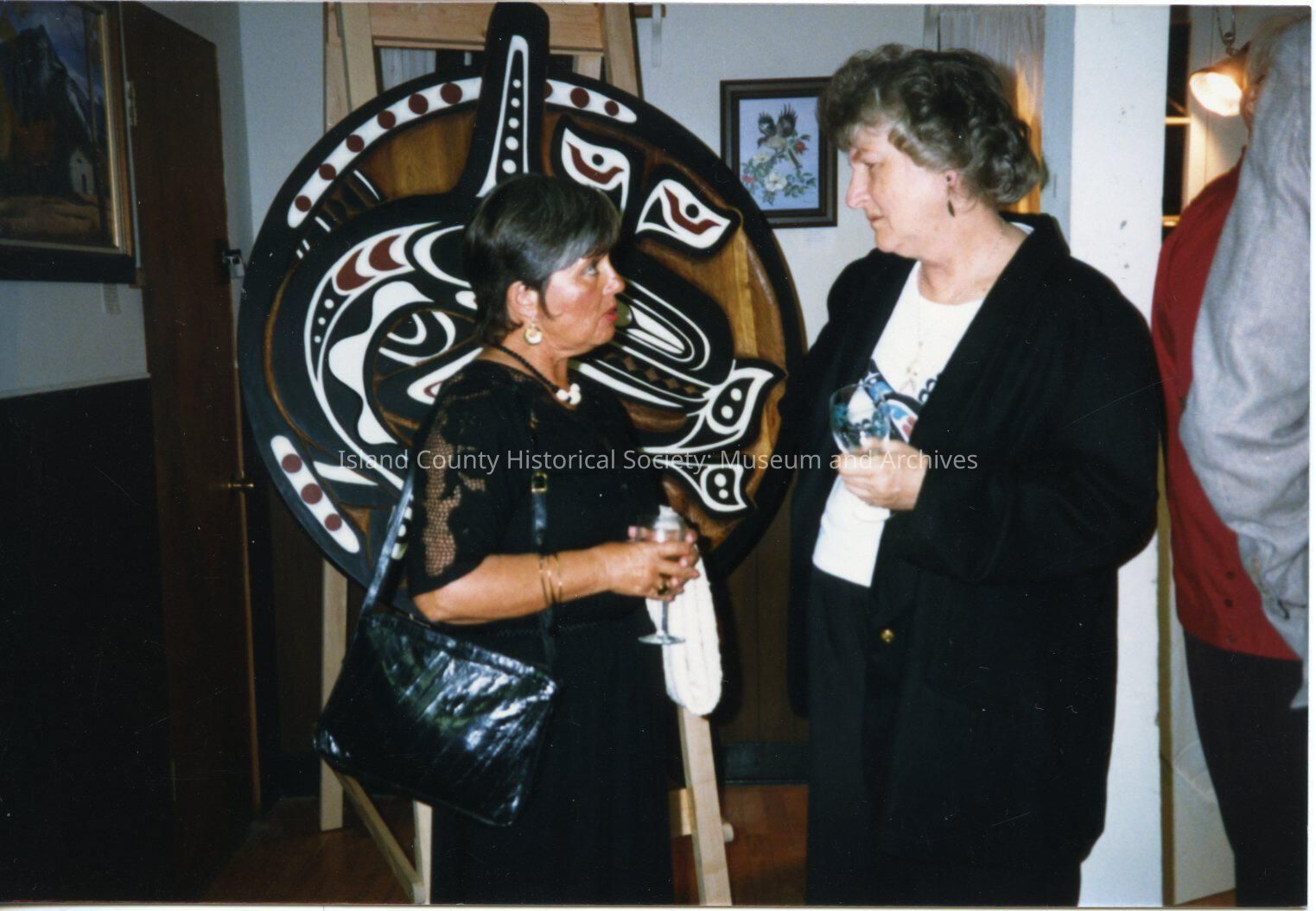 Photo of two women standing in a room. Native American whale piece behind. Written on the back of the photo is Sylvia Folkart.