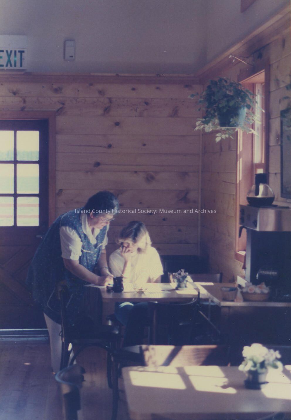 A color photograph of a group of two women looking at a piece of paper at a table inside the Coupeville Wharf