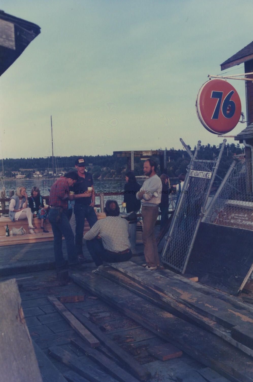 A color photograph of a group of people standing on the back porchof the Coupeville Wharf