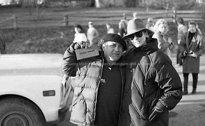 Danny DeVito and possibly Kathleen Turner standing together. DeVito is holding his museum brick. They are in Coupeville on the set of "War of the Roses"