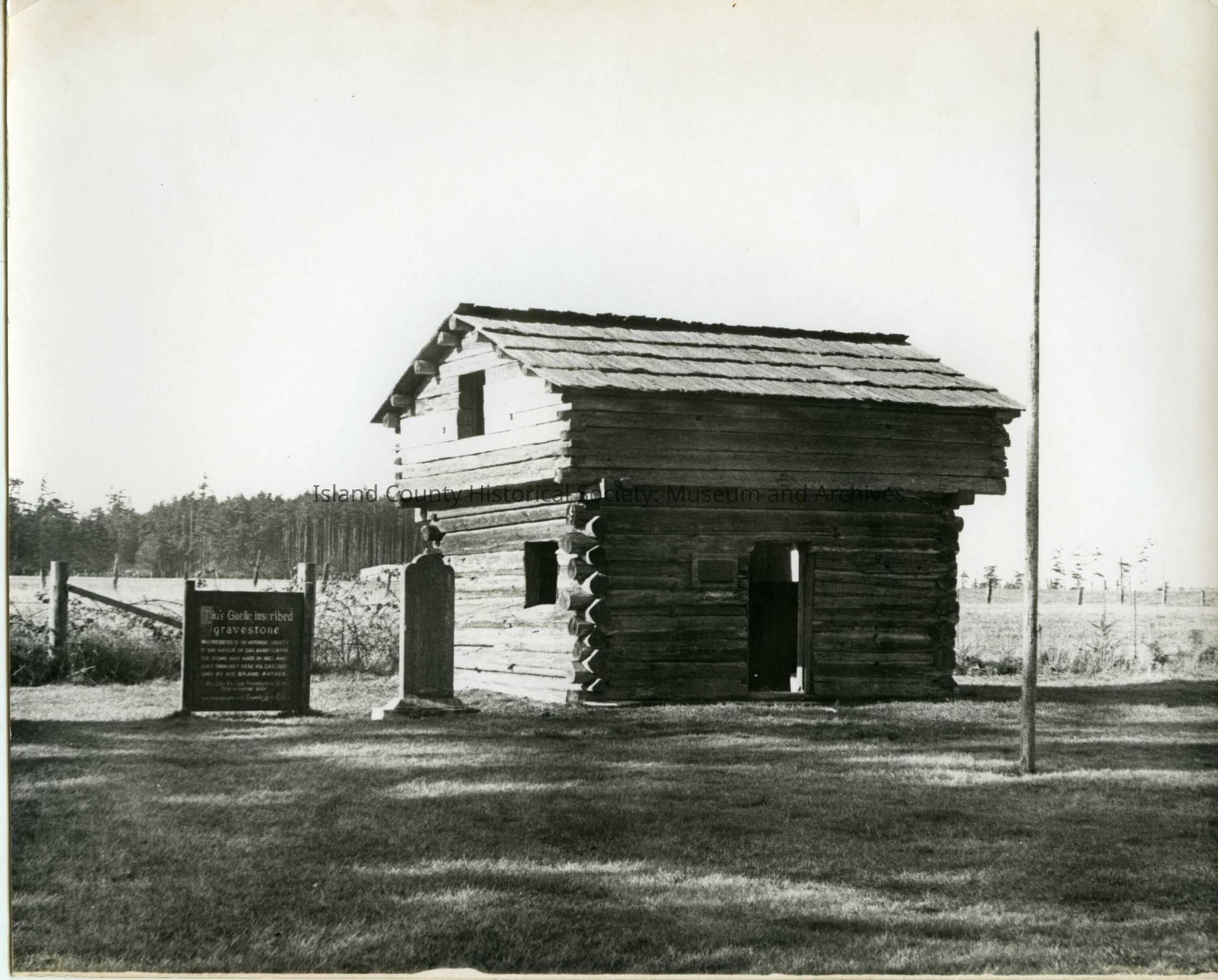 Front and side of Davis blockhouse. Door on the right with a small sign on the wall to the left. A tombstone is to the left next to a sign about the Gaelic inscription on the tombstone. There is a flagpole in front of the door. On the back: Davis blockhouse Sunnyside Cemetery.Collection