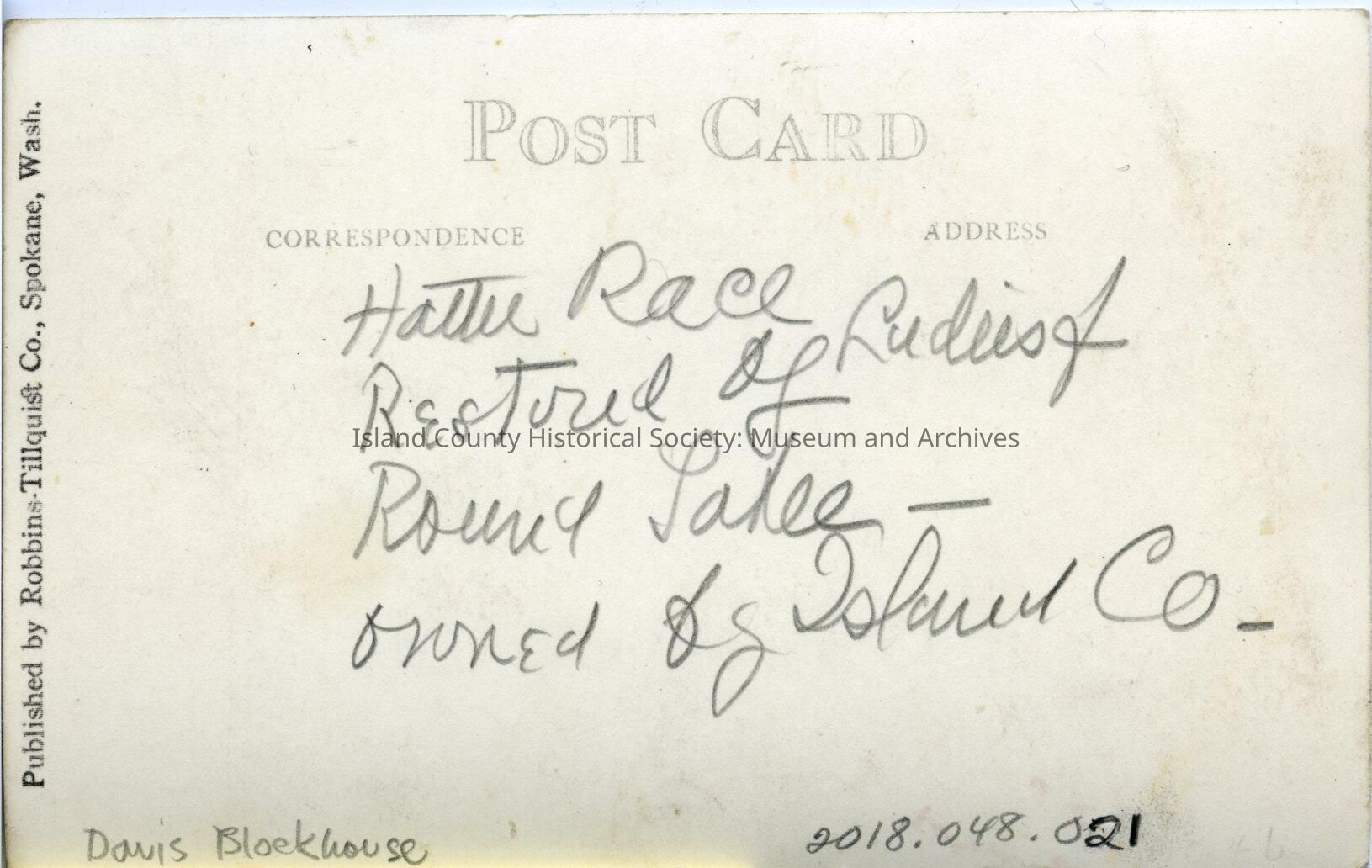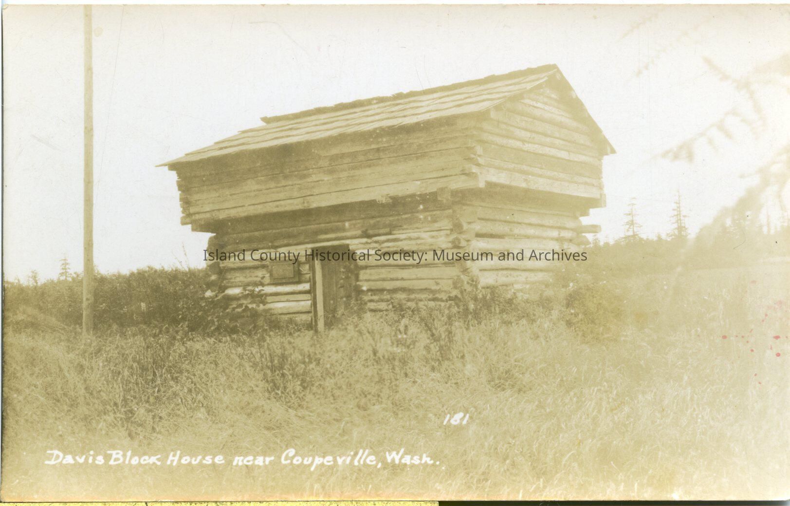 Front and side of Davis blockhouse. No windows on the top. Door on the right with a small sign on the wall to the left. There is a flagpole in front of the door. Caption on the front: Davis Blockhouse near Coupeville, Wash. 181